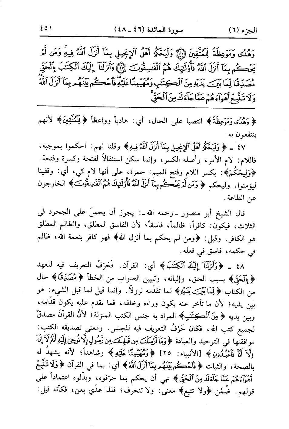 وَأَنْزَلْنَا إِلَيْكَ الْكِتَابَ بِالْحَقِّ مُصَدِّقًا لِمَا بَيْنَ يَدَيْهِ مِنَ الْكِتَابِ وَمُهَيْمِنًا عَلَيْهِ فَاحْكُمْ بَيْنَهُمْ بِمَا أَنْزَلَ اللَّهُ وَلَا تَتَّبِعْ أَهْوَاءَهُمْ عَمَّا جَاءَكَ مِنَ الْحَقِّ لِكُلٍّ جَعَلْنَا مِنْكُمْ شِرْعَةً وَمِنْهَاجًا وَلَوْ شَاءَ اللَّهُ لَجَعَلَكُمْ أُمَّةً وَاحِدَةً وَلَكِنْ لِيَبْلُوَكُمْ فِي مَا آتَاكُمْ فَاسْتَبِقُوا الْخَيْرَاتِ إِلَى اللَّهِ مَرْجِعُكُمْ جَمِيعًا فَيُنَبِّئُكُمْ بِمَا كُنْتُمْ فِيهِ تَخْتَلِفُونَ (48)