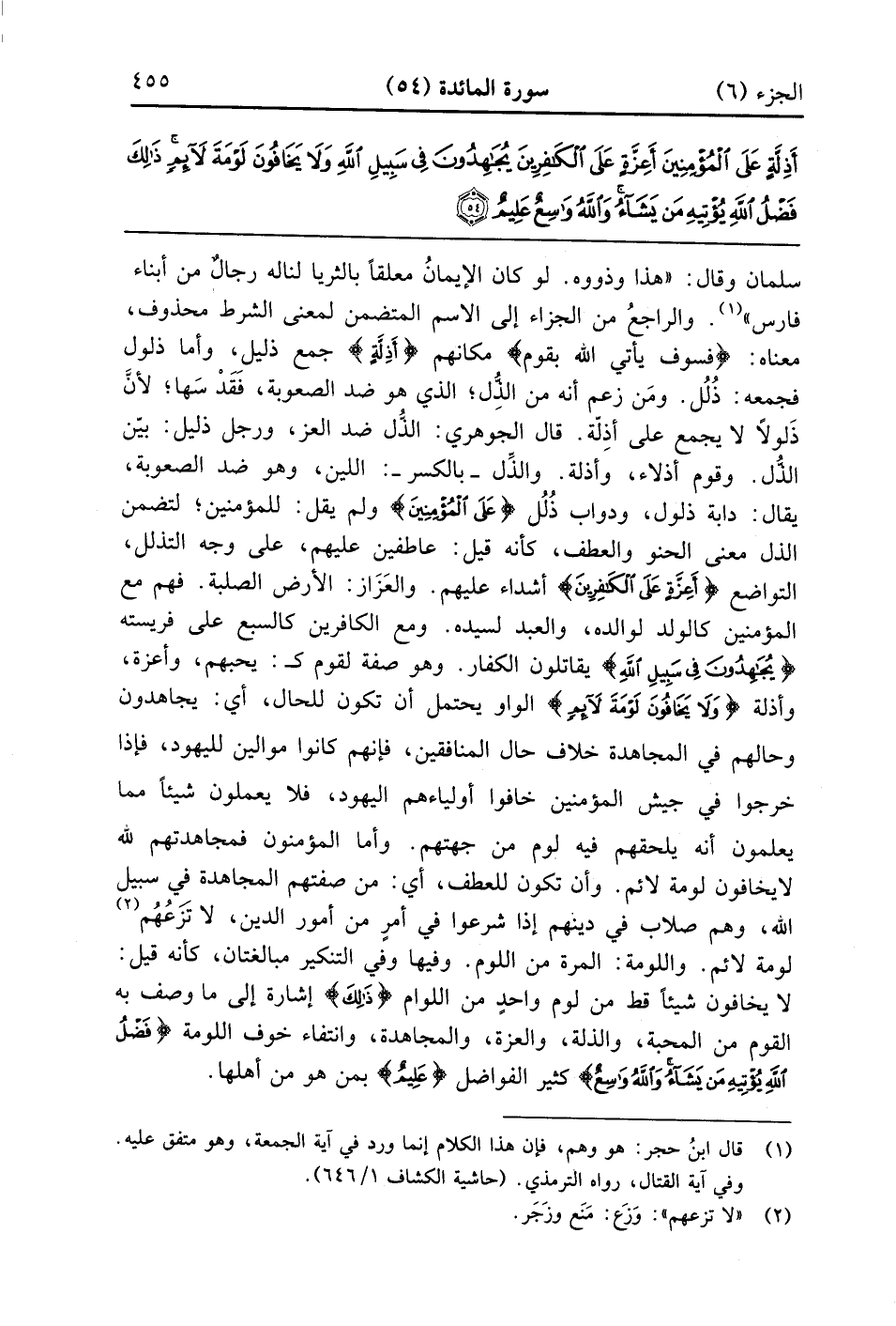 سلمان وقال هذا وذووه لو كان الإيمان معلقاً بالثريا لناله رجال من أبناء فارس والراجع من الجزاء إلى الاسم المتضمن لمعنى الشرط محذوف معناه فسوف يأتي الله بقوم مكانهم {أَذِلَّةٍ} جمع ذليل وأما ذلول فجمعه ذلل ومن زعم أنه من الذُّلِ الذي هو ضد الصعوبة فقدسها لأن ذلولاً لا يجمع على أذلة قال الجوهري الذل ضد العز ورجل ذليل بيّن الذل وقوم أذلاء وأذلة والذل بالكسر اللين وهو ضد الصعوبة يقال دابة ذلول ودواب ذلل {عَلَى المؤمنين} ولم يقل للمؤمنين لتضمن الذل معنى الحنو والعطف كأنه قيل عاطفين عليهم على وجه التذلل والتواضع {أَعِزَّةٍ عَلَى الكافرين} أشجداء عليهم والعزاز الأرض الصلبة فهم مع المؤمنين كالولد لوالده والعبد لسيده ومع الكافرين كالسبع على فريسته {يجاهدون فِي سَبِيلِ الله} يقاتلون الكفار وهو صفة لقوم كحبهم واعزة وأذلة {وَلاَ يخافون لَوْمَةَ لائِمٍ} الواو يحتمل أن تكون للحال أى يجهادون وحالهم في المجاهدة خلاف حال المنافقين فإنهم كانوا موالين لليهود فإذا خرجوا في جيش المؤمنين خافوا أولياءهم اليهود فلا يعملون شيئاً مما يعلمون أنه يلحقهم فيه لوم من جهتهم وأما المؤمنون فمجاهدتهم لله لا يخافون لومة لائم وأن تكون للعطف أي من صفتهم المجاهدة في سبيل الله وهم صلاب فى دينهم إذا شرعوا فيه أمر من أمور الدين لا تزعهم لومة لائم واللومة المرمة من اللوم وفيها وفي التنكير مبالغتان كأنه قيل لا يخافون شيئاً قط من لوم واحد من اللوام {ذلك} إشارة إلى ما وصف به القوم من المحبة والذلة والعزة والمجاهدة وانتفاء خوف اللومة {فَضْلُ الله يُؤْتِيهِ مَن يَشَاء والله واسع} كثير الفواضل {عَلِيمٌ} بمن هو من أهلها
