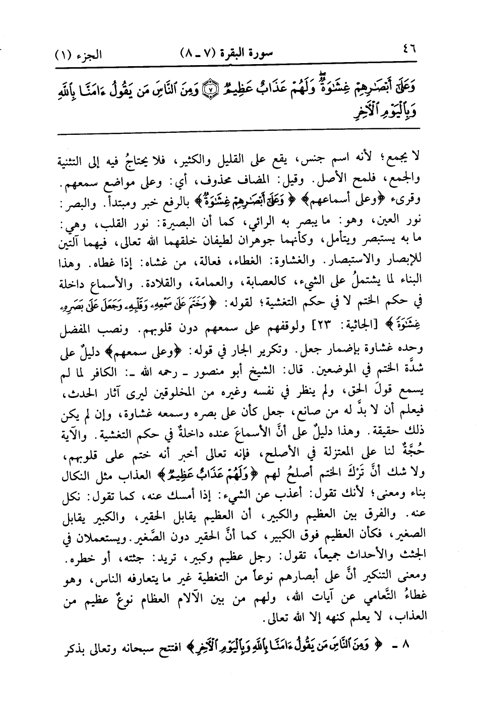 لا يجمع لأنه اسم جنس يقع على القليل والكثير فلا يحتاج فيه إلى التثنية والجمع فلمح الأصل وقيل المضاف محذوف اى وعلى مواضع سمعهم وقرئ على أسماعهم {وعلى أبصارهم غشاوة} بالرفع خبر ومبتدأ والبصر نور العين وهو ما يبصر به الرائي كما أن البصيرة نور القلب وهي ما به يستبصر ويتأمل وكأنهما جوهران لطيفان خلقهما الله تعالى فيهما آلتين للإبصار والاستبصار والغشاوة الغطاء فعالة من غشاه إذا غطاه وهذا البناء لما يشتمل على الشئ كالعصابة والعمامة والقلادة والأسماع داخلة في حكم الختم لا في حكم التغشية لقوله وَخَتَمَ على سَمْعِهِ وَقَلْبِهِ وَجَعَلَ على بَصَرِهِ غشاوة ولوقفهم على سمعهم دون قلوبهم ونصب المفضل وحده غشاوة بإضمار جعل وتكرير الجار في قوله وعلى سمعهم دليل على شدة الختم في الموضعين قال الشيخ الإمام أبو منصور بن على رحمه الله الكافر لما لم يسمع قول الحق ولم ينظر فى نفسه وغيره من المخلوقات ليرى آثار الحدوث فيعلم أن لا بد له من صانع جعل كأن على بصره وسمعه غشاوة وإن لم يكن ذلك حقيقة وهذا دليل على أن الأسماع عنده داخلة في حكم التغشية والآية حجة لنا على المعتزلة في الأصلح فإنه أخبر أنه ختم على قلوبهم ولا شك أن ترك الختم أصلح لهم {وَلَهُمْ عَذَابٌ عظِيمٌ} العذاب مثل النكال بناء ومعنى لأنك تقول أعذب عن الشئ إذا أمسك عنه كما تقول نكل عنه والفرق بين العظيم والكبير أن العظيم يقابل الحقير والكبير يقابل الصغير فكأن العظيم فوق الكبير كما أن الحقير دون الصغير ويستعملان في الجثة والأحداث جميعاً تقول رجل عظيم وكبير تريد جثته أو خطره ومعنى التنكير أن على أبصارهم نوعاً من التغطية غير ما يتعارفه الناس وهو غطاء التعامي عن آيات الله ولهم من بين الآلام العظام نوع عظيم من العذاب لا يعلم كنهه إلا الله