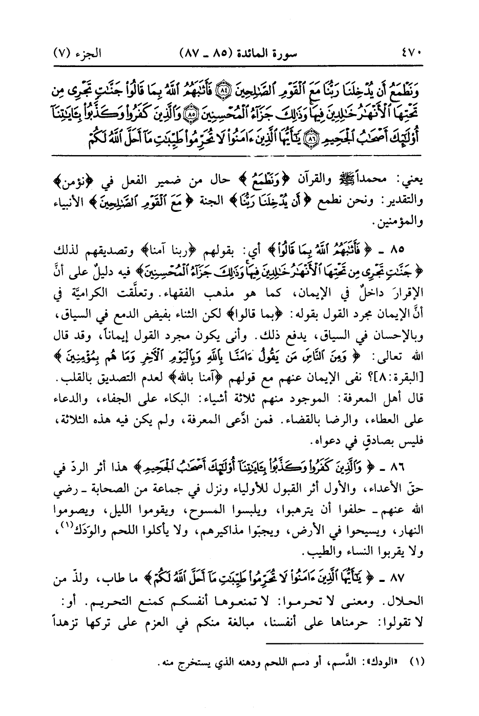 ونزل فى جماعة من الصحابة رضى الله عنهم حلفوا أن يترهبوا ويلبسوا المسوح ويقوموا الليل ويصوموا