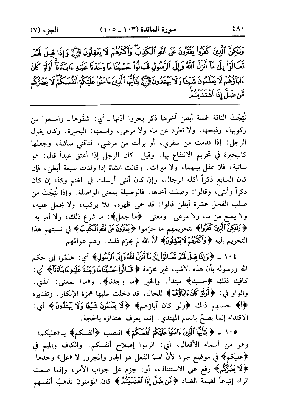 نتجت الناقة خمسة أبطن آخرها ذكر بحروا إذنها أى شقوها وامتنعوا عن ركوبها وذبحا ولا تطرد عن ماء ولا مرعى واسمها البحيرة وكان يقول الرجل إذا قدمت من سفري أو برأت من مرضي فناقتي سائبة وجعلها كالبحيرة في تحريم الانتفاع بها وقيل كان الرجل إذا أعتق عبداً قال هو سائبة فلا عقل بينهما ولا ميراث وكانت الشاة إذا ولدت سبعة أبطن فإن كان السابع ذكراً أكله الرجال وإن كان أنثى أرسلت في الغنم وكذا إن كان ذكراً وأنثى وقالوا وصلت أخاها فالوصيلة بمعنى الواصلة وإذا نتجت من صلب الفحل عشرة أبطن قالوا قد حمى ظهره فلا يركب ولا يحمل عليه ولا يمنع من ماء ولا مرعى ومعنى ما جعل ما شرع ذلك ولا أمر به {ولكن الذين كَفَرُواْ} بتحريمهم ما حرموا {يَفْتَرُونَ عَلَى الله الكذب} في نسبتهم هذا التحريم إليه {وَأَكْثَرُهُمْ لاَ يَعْقِلُونَ} أن الله لم يحرم ذلك وهم عوامهم