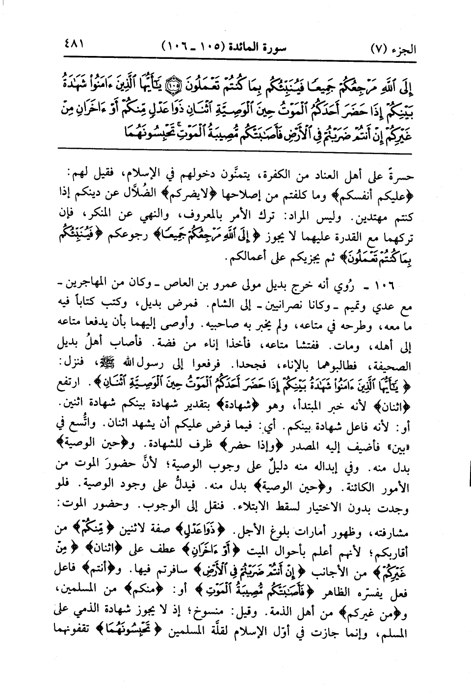 يَا أَيُّهَا الَّذِينَ آمَنُوا شَهَادَةُ بَيْنِكُمْ إِذَا حَضَرَ أَحَدَكُمُ الْمَوْتُ حِينَ الْوَصِيَّةِ اثْنَانِ ذَوَا عَدْلٍ مِنْكُمْ أَوْ آخَرَانِ مِنْ غَيْرِكُمْ إِنْ أَنْتُمْ ضَرَبْتُمْ فِي الْأَرْضِ فَأَصَابَتْكُمْ مُصِيبَةُ الْمَوْتِ تَحْبِسُونَهُمَا مِنْ بَعْدِ الصَّلَاةِ فَيُقْسِمَانِ بِاللَّهِ إِنِ ارْتَبْتُمْ لَا نَشْتَرِي بِهِ ثَمَنًا وَلَوْ كَانَ ذَا قُرْبَى وَلَا نَكْتُمُ شَهَادَةَ اللَّهِ إِنَّا إِذًا لَمِنَ الْآثِمِينَ (106)