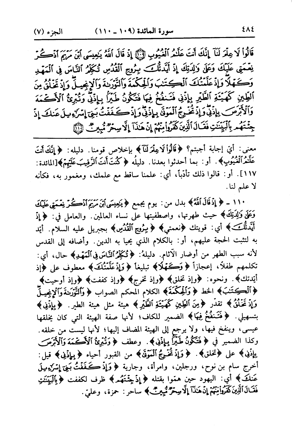 إِذْ قَالَ اللَّهُ يَا عِيسَى ابْنَ مَرْيَمَ اذْكُرْ نِعْمَتِي عَلَيْكَ وَعَلَى وَالِدَتِكَ إِذْ أَيَّدْتُكَ بِرُوحِ الْقُدُسِ تُكَلِّمُ النَّاسَ فِي الْمَهْدِ وَكَهْلًا وَإِذْ عَلَّمْتُكَ الْكِتَابَ وَالْحِكْمَةَ وَالتَّوْرَاةَ وَالْإِنْجِيلَ وَإِذْ تَخْلُقُ مِنَ الطِّينِ كَهَيْئَةِ الطَّيْرِ بِإِذْنِي فَتَنْفُخُ فِيهَا فَتَكُونُ طَيْرًا بِإِذْنِي وَتُبْرِئُ الْأَكْمَهَ وَالْأَبْرَصَ بِإِذْنِي وَإِذْ تُخْرِجُ الْمَوْتَى بِإِذْنِي وَإِذْ كَفَفْتُ بَنِي إِسْرَائِيلَ عَنْكَ إِذْ جِئْتَهُمْ بِالْبَيِّنَاتِ فَقَالَ الَّذِينَ كَفَرُوا مِنْهُمْ إِنْ هَذَا إِلَّا سِحْرٌ مُبِينٌ (110)