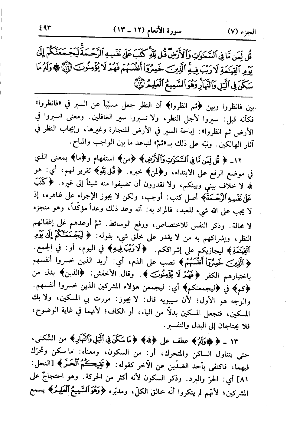 {قُل لِّمَن مَّا فِي السماوات والأرض} من استفهام وما بمعنى الذى فى موضع الرفع على الابتداء ولمن خبره {قل لله} تقدير لهم أى هو لله لاخلاف بيني وبينكم ولا تقدرون أن تضيفوا منه شيئاً إلى غيره {كَتَبَ على نَفْسِهِ الرحمة} أصل كتب أوجب ولكن لا يجوز الإجراء على ظاهره إذ لا يجب على الله شيء للعبد فالمراد به أنه وعد ذلك وعداً مؤكداً وهو منجزه لا محالة وذكر النفس للاختصاص ورفع الوسائط ثم أو عدهم على إغفالهم النظر وإشراكهم به من لا يقدر على خلق شيء بقوله {لَيَجْمَعَنَّكُمْ إلى يَوْمِ القيامة} فيجازيكم على إشراككم {لاَ رَيْبَ فِيهِ} في اليوم أو في الجمع {الذين خَسِرُواْ أَنفُسَهُم} نصب على الذم أي أريد الذين خسروا أنفسهم باختيارهم الكفر {فَهُمْ لاَ يُؤْمِنُونَ} وقال الأخفش الذين بدل من كم فى ليجمعنكم أى ليجمعن من هؤلاء المشركين الذين خسروا أنفسهم والوجه هو الأول لأن سيبويه قال لا يجوز مررت بي المسكين ولا بك المسكين فتجعل المسكين بدلاً من الياء أو الكاف لأنهما في غاية الوضوح فلا يحتاجان إلى البدل والتفسير