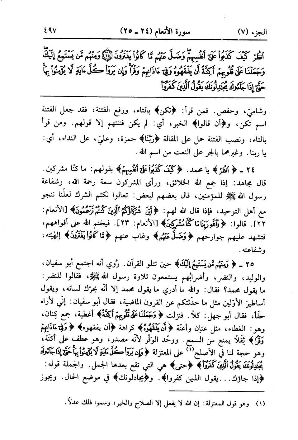 {وَمِنْهُمْ مَّن يَسْتَمِعُ إِلَيْكَ} حين تتلو القرآن روي أنه اجتمع أبو سفيان والوليد والنضر وأضرابهم يستمعون تلاوة رسول الله صلى الله عليه وسلم فقالوا للنضر ما يقول محمد فقال والله ما أدري ما يقول محمد ألا إنه يحرك لسانه ويقول أساطير الأولين مثل ما حدثتكم عن القرون الماضية فقال أبو سفيان إني لأراه حقاً فقال أبو جهل كلا فنزلت {وَجَعَلْنَا على قُلُوبِهِمْ أَكِنَّةً} أغطية جمع كنان وهو الغطاء مثل عنان وأعنة {أن يفقهوه} كراهة أن يفقهوه {وفي آذانهم وَقْرًا} ثقلا يمنع من السمع ووحد الوقر لأنه مصدر وهو عطف على أَكِنَّةً وهو حجة لنا في الأصلح على المعتزلة {وَإِن يروا كل آية لا يؤمنوا بها حتى إذا جاؤوك يجادلونك يَقُولُ الذين كَفَرُواْ} حتى هي التي تقع بعدها الجمل والجملة قوله إذا جاءوك يقول الذين كفروا ويجادلونك في موضع الحال ويجوز