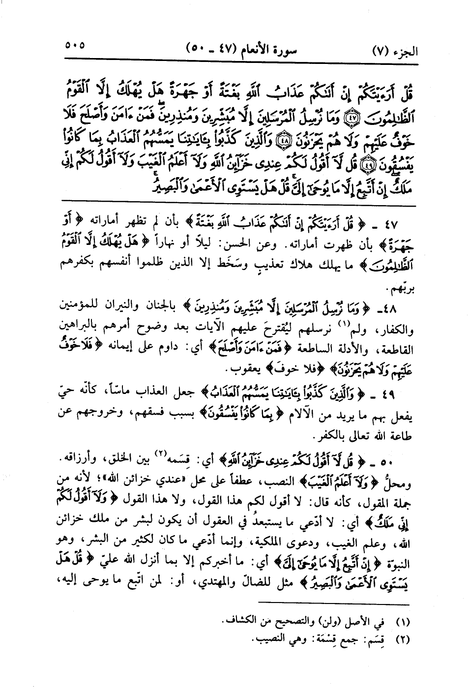 قُلْ لَا أَقُولُ لَكُمْ عِنْدِي خَزَائِنُ اللَّهِ وَلَا أَعْلَمُ الْغَيْبَ وَلَا أَقُولُ لَكُمْ إِنِّي مَلَكٌ إِنْ أَتَّبِعُ إِلَّا مَا يُوحَى إِلَيَّ قُلْ هَلْ يَسْتَوِي الْأَعْمَى وَالْبَصِيرُ أَفَلَا تَتَفَكَّرُونَ (50)