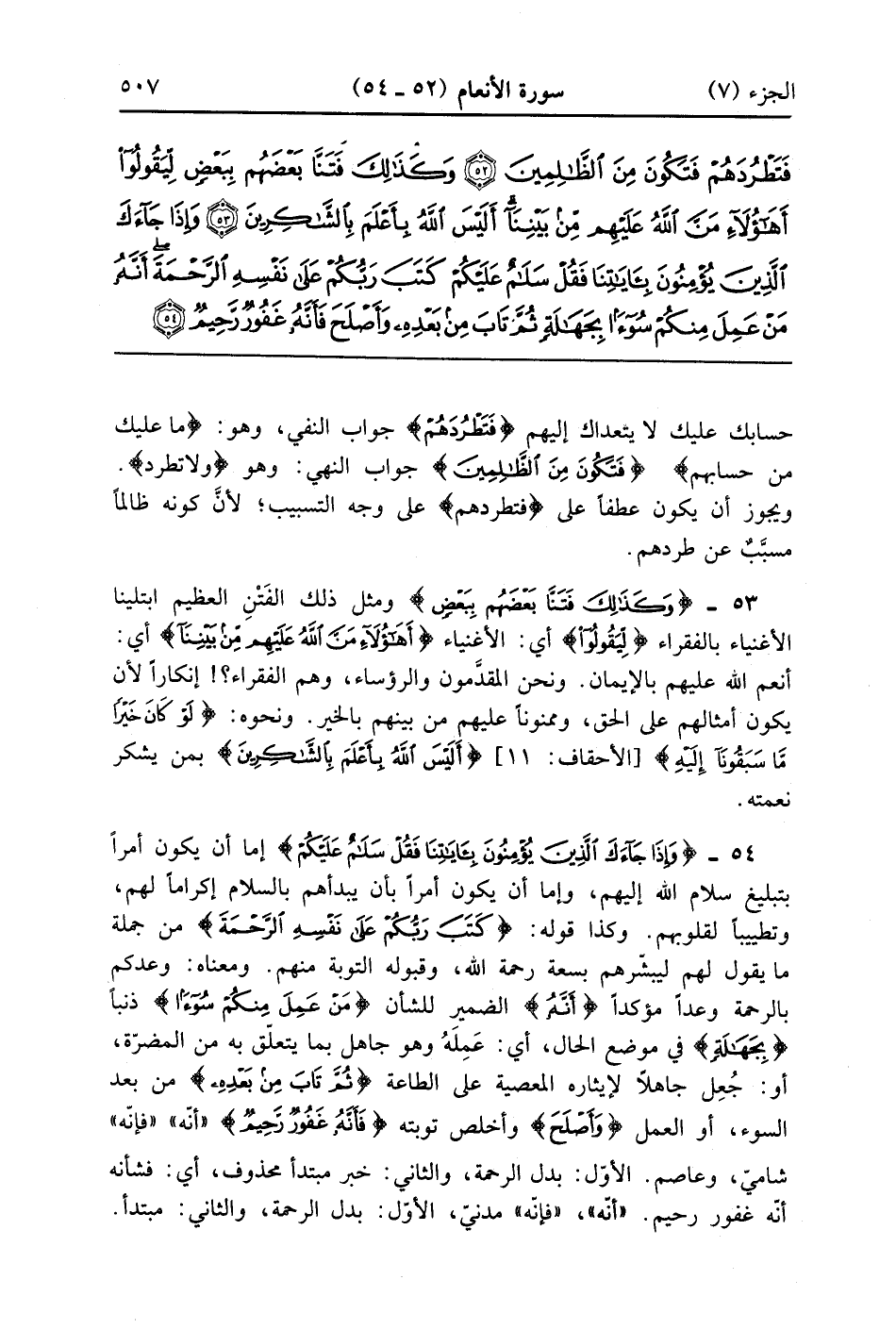 وَإِذَا جَاءَكَ الَّذِينَ يُؤْمِنُونَ بِآيَاتِنَا فَقُلْ سَلَامٌ عَلَيْكُمْ كَتَبَ رَبُّكُمْ عَلَى نَفْسِهِ الرَّحْمَةَ أَنَّهُ مَنْ عَمِلَ مِنْكُمْ سُوءًا بِجَهَالَةٍ ثُمَّ تَابَ مِنْ بَعْدِهِ وَأَصْلَحَ فَأَنَّهُ غَفُورٌ رَحِيمٌ (54)
