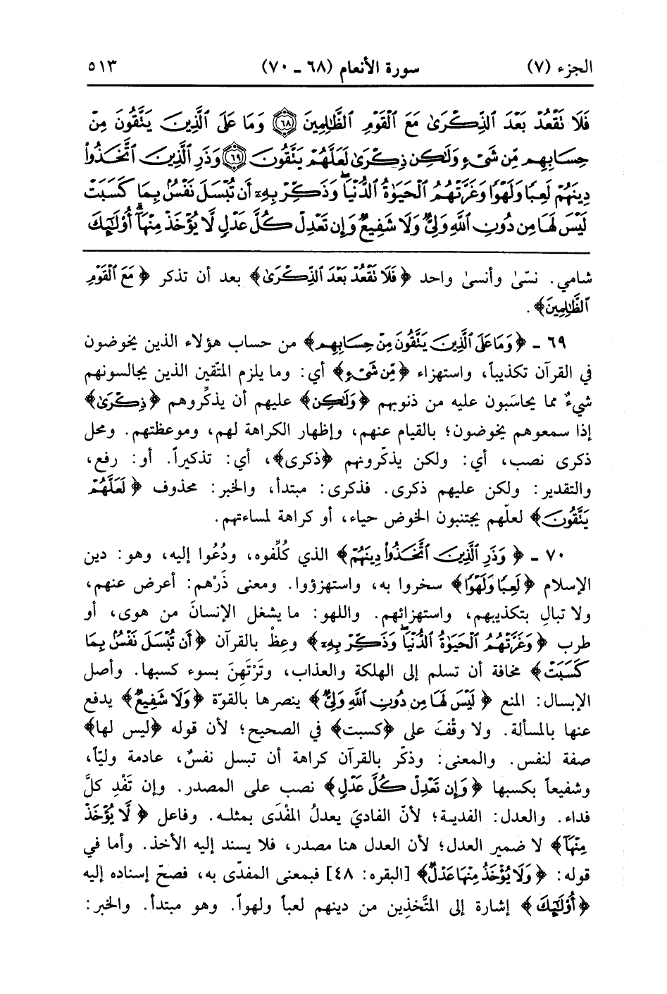 وَذَرِ الَّذِينَ اتَّخَذُوا دِينَهُمْ لَعِبًا وَلَهْوًا وَغَرَّتْهُمُ الْحَيَاةُ الدُّنْيَا وَذَكِّرْ بِهِ أَنْ تُبْسَلَ نَفْسٌ بِمَا كَسَبَتْ لَيْسَ لَهَا مِنْ دُونِ اللَّهِ وَلِيٌّ وَلَا شَفِيعٌ وَإِنْ تَعْدِلْ كُلَّ عَدْلٍ لَا يُؤْخَذْ مِنْهَا أُولَئِكَ الَّذِينَ أُبْسِلُوا بِمَا كَسَبُوا لَهُمْ شَرَابٌ مِنْ حَمِيمٍ وَعَذَابٌ أَلِيمٌ بِمَا كَانُوا يَكْفُرُونَ (70)