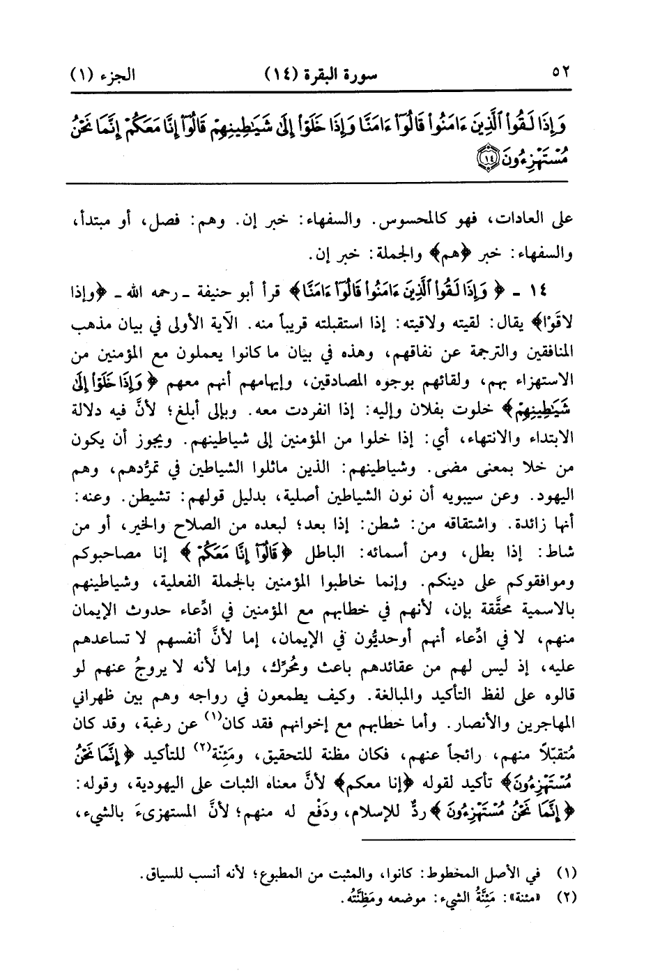 وَإِذَا لَقُوا الَّذِينَ آمَنُوا قَالُوا آمَنَّا وَإِذَا خَلَوْا إِلَى شَيَاطِينِهِمْ قَالُوا إِنَّا مَعَكُمْ إِنَّمَا نَحْنُ مُسْتَهْزِئُونَ (14)