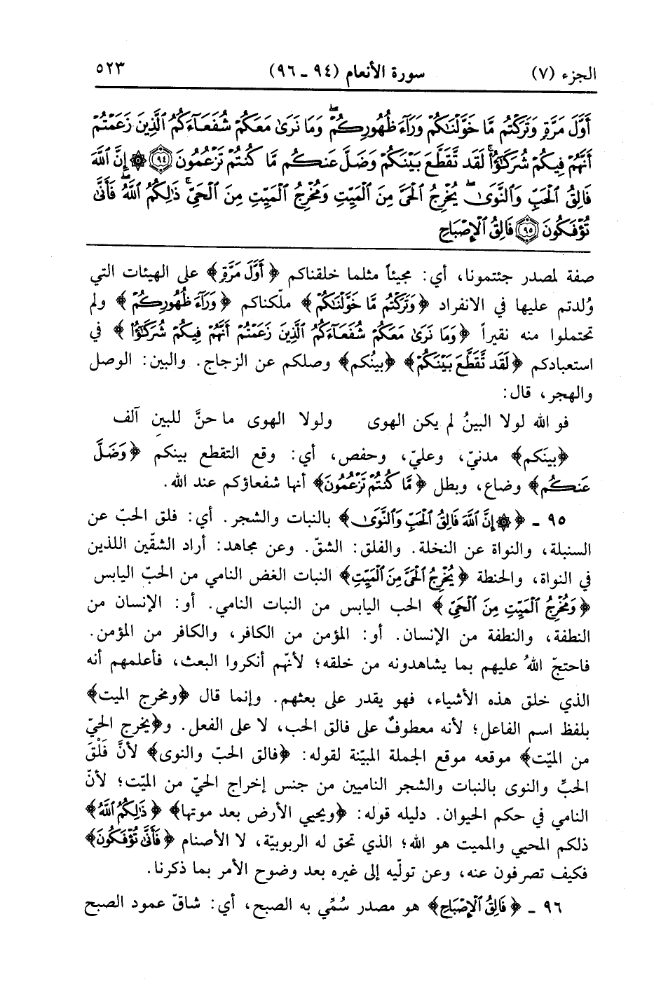 إِنَّ اللَّهَ فَالِقُ الْحَبِّ وَالنَّوَى يُخْرِجُ الْحَيَّ مِنَ الْمَيِّتِ وَمُخْرِجُ الْمَيِّتِ مِنَ الْحَيِّ ذَلِكُمُ اللَّهُ فَأَنَّى تُؤْفَكُونَ (95)