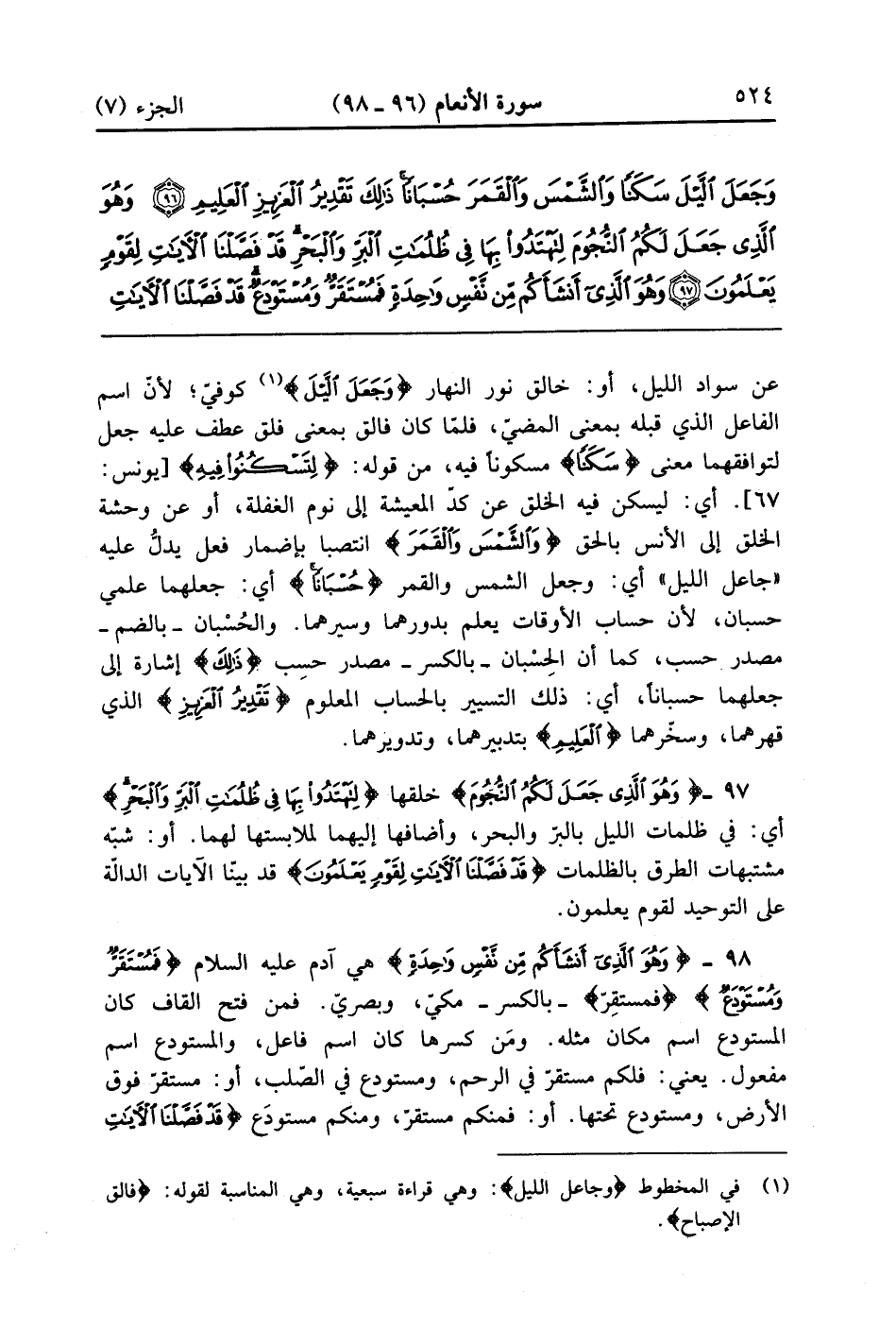 عن سواد الليل أو خالق نورالنهار {وجعل الليل} وجعل الليل كوفي لأن اسم الفاعل الذي قبله بمعنى المضي فلما كان فالق بمعنى فلق عطف عليه جَعَلَ لتوافقهما معنى {سَكَناً} مسكوناً فيه من قوله لتسكنوا فيه أي ليسكن فيه الخلق عن كد المعيشة إلى نوم الغفلة أو عن وحشة الخلق إلى الأنس بالحق {والشمس والقمر} انتصبا بإضمار فعل يدل عليه جاعل الليل أي وجعل الشمس والقمر {حُسْبَاناً} أي جعلهما على حسبان لأن حساب الأوقات يعلم بدورهما وسيرهما والحسبان بالضم مصدر حسب كما أن الحسبان بالكسر مصدر حسب {ذلك} إشارة إلى جعلهما حسباناً أي ذلك التسيير بالحساب المعلوم {تَقْدِيرُ العزيز} الذي قهرهما وسخرهما {العليم} بتدبيرهما وتدويرهما