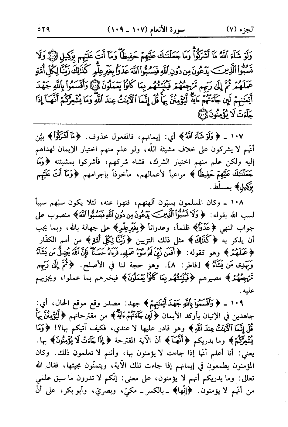 وَلَا تَسُبُّوا الَّذِينَ يَدْعُونَ مِنْ دُونِ اللَّهِ فَيَسُبُّوا اللَّهَ عَدْوًا بِغَيْرِ عِلْمٍ كَذَلِكَ زَيَّنَّا لِكُلِّ أُمَّةٍ عَمَلَهُمْ ثُمَّ إِلَى رَبِّهِمْ مَرْجِعُهُمْ فَيُنَبِّئُهُمْ بِمَا كَانُوا يَعْمَلُونَ (108)