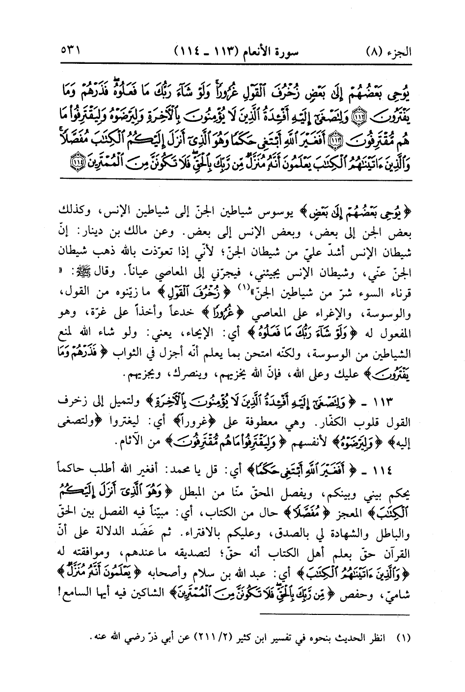 أَفَغَيْرَ اللَّهِ أَبْتَغِي حَكَمًا وَهُوَ الَّذِي أَنْزَلَ إِلَيْكُمُ الْكِتَابَ مُفَصَّلًا وَالَّذِينَ آتَيْنَاهُمُ الْكِتَابَ يَعْلَمُونَ أَنَّهُ مُنَزَّلٌ مِنْ رَبِّكَ بِالْحَقِّ فَلَا تَكُونَنَّ مِنَ الْمُمْتَرِينَ (114)