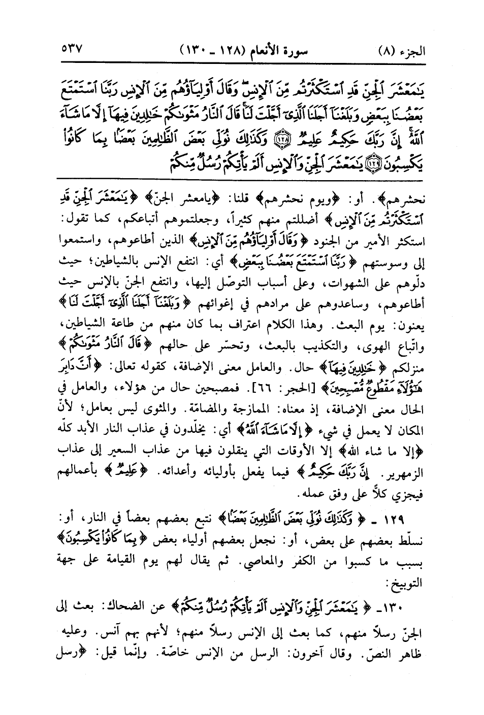 يَا مَعْشَرَ الْجِنِّ وَالْإِنْسِ أَلَمْ يَأْتِكُمْ رُسُلٌ مِنْكُمْ يَقُصُّونَ عَلَيْكُمْ آيَاتِي وَيُنْذِرُونَكُمْ لِقَاءَ يَوْمِكُمْ هَذَا قَالُوا شَهِدْنَا عَلَى أَنْفُسِنَا وَغَرَّتْهُمُ الْحَيَاةُ الدُّنْيَا وَشَهِدُوا عَلَى أَنْفُسِهِمْ أَنَّهُمْ كَانُوا كَافِرِينَ (130)