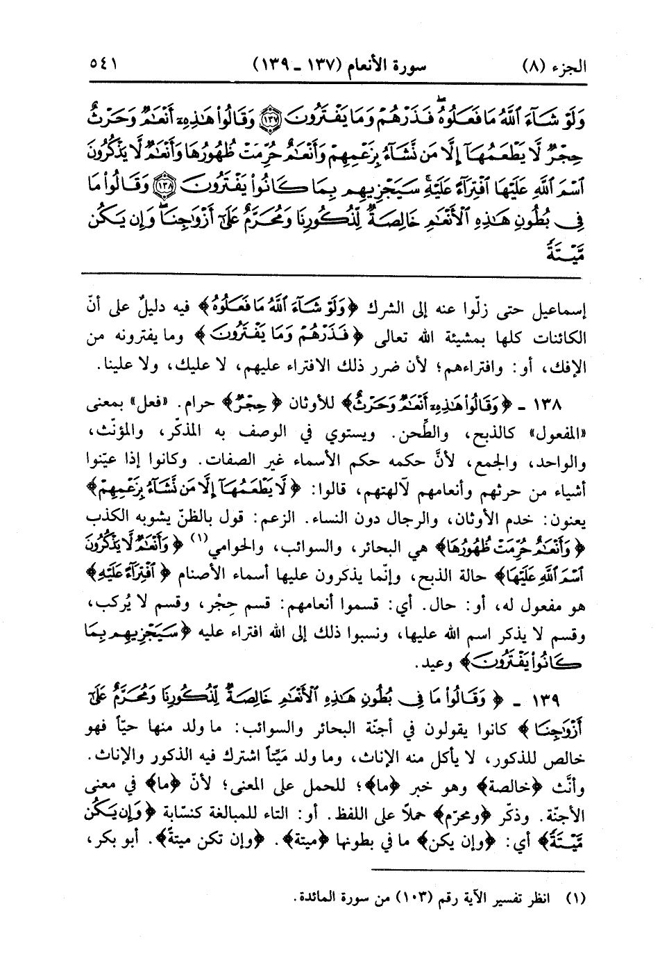 وَقَالُوا هَذِهِ أَنْعَامٌ وَحَرْثٌ حِجْرٌ لَا يَطْعَمُهَا إِلَّا مَنْ نَشَاءُ بِزَعْمِهِمْ وَأَنْعَامٌ حُرِّمَتْ ظُهُورُهَا وَأَنْعَامٌ لَا يَذْكُرُونَ اسْمَ اللَّهِ عَلَيْهَا افْتِرَاءً عَلَيْهِ سَيَجْزِيهِمْ بِمَا كَانُوا يَفْتَرُونَ (138)