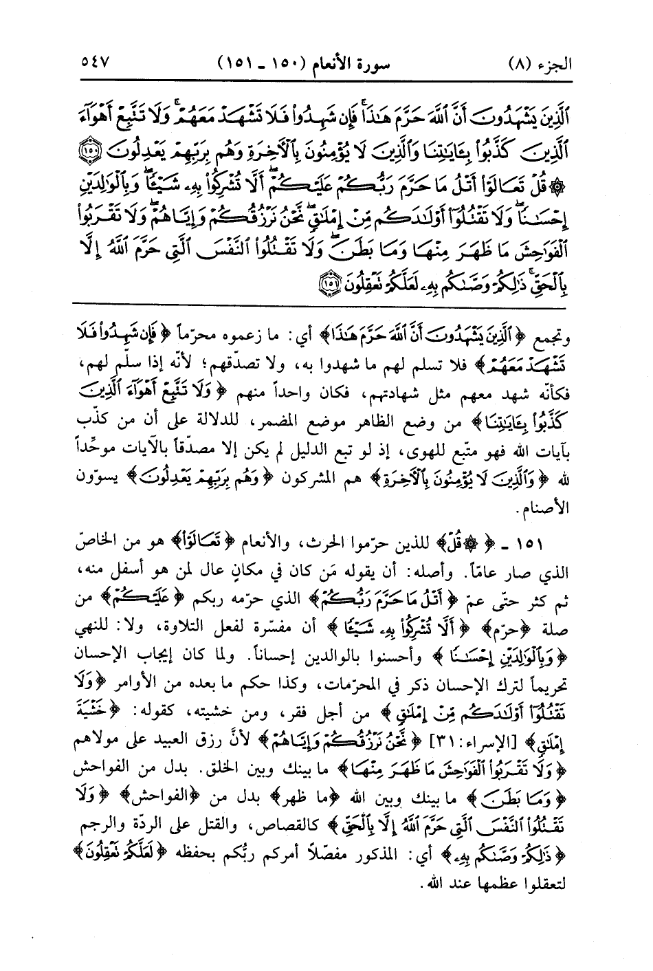 قُلْ تَعَالَوْا أَتْلُ مَا حَرَّمَ رَبُّكُمْ عَلَيْكُمْ أَلَّا تُشْرِكُوا بِهِ شَيْئًا وَبِالْوَالِدَيْنِ إِحْسَانًا وَلَا تَقْتُلُوا أَوْلَادَكُمْ مِنْ إِمْلَاقٍ نَحْنُ نَرْزُقُكُمْ وَإِيَّاهُمْ وَلَا تَقْرَبُوا الْفَوَاحِشَ مَا ظَهَرَ مِنْهَا وَمَا بَطَنَ وَلَا تَقْتُلُوا النَّفْسَ الَّتِي حَرَّمَ اللَّهُ إِلَّا بِالْحَقِّ ذَلِكُمْ وَصَّاكُمْ بِهِ لَعَلَّكُمْ تَعْقِلُونَ (151)