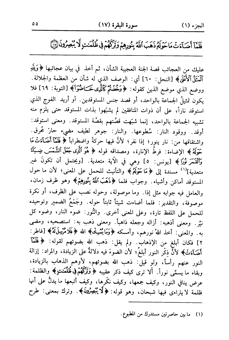 استوقد أوقد ووقود النار سطوعها والنار جوهر لطيف مضى حار محرق واشتقاقها من نار ينور إذا نفر لأن فيها حركة واضطراباً {فَلَمَّا أَضَاءَتْ مَا حَوْلَهُ} الإضاءة فرط الإنارة ومصداقه قوله هُوَ الذي جَعَلَ الشمس ضِيَاء والقمر نُوراً وهي في الآية متعدية ويحتمل أن تكون غير متعدية مسندة إلى ما حوله والتأنيث للحمل على المعنى لأن ما حول المستوقد أماكن وأشياء وجواب فلما {ذَهَبَ الله بِنُورِهِمْ} وهو ظرف زمان والعامل فيه جوابه مثل إذا وما موصولة وحوله نصب على الظرف أو نكرة موصوفة والتقدير فلما أضاءت شيئاً ثابتاً حوله وجمع الضمير وتوحيد للحمل على اللفظ تارة وعلى المعنى أخرى والنور ضوء النار وضوء كل نير ومعنى أذهبه أزاله وجعله ذاهباً ومعنى ذهب به استصحبه ومضى به والمعنى أخذ الله بنورهم وأمسكه وما يمسك فلا مرسل له فكان أبلغ من الإذهاب ولم يقل ذهب الله بضوئهم لقوله فلما أضاءت لأن ذكر النور أبلغ لأن الضوء فيه دلالة على الزيادة والمراد إزالة النور عنهم رأساً ولو قيل ذهب الله بضوئهم لأوهم الذهاب بالزيادة وبقاء ما يسمى نوراً ألا ترى كيف ذكر عقيبه {وَتَرَكَهُمْ فِي ظلمات} والظلمة عرض ينافي النور وكيف جمعها وكيف نكرها وكيف أتبعها ما يدل على أنها ظلمة لا تراءى فيها شبحان وهو قوله {لاَّ يُبْصِرُونَ} وترك بمعنى طرح