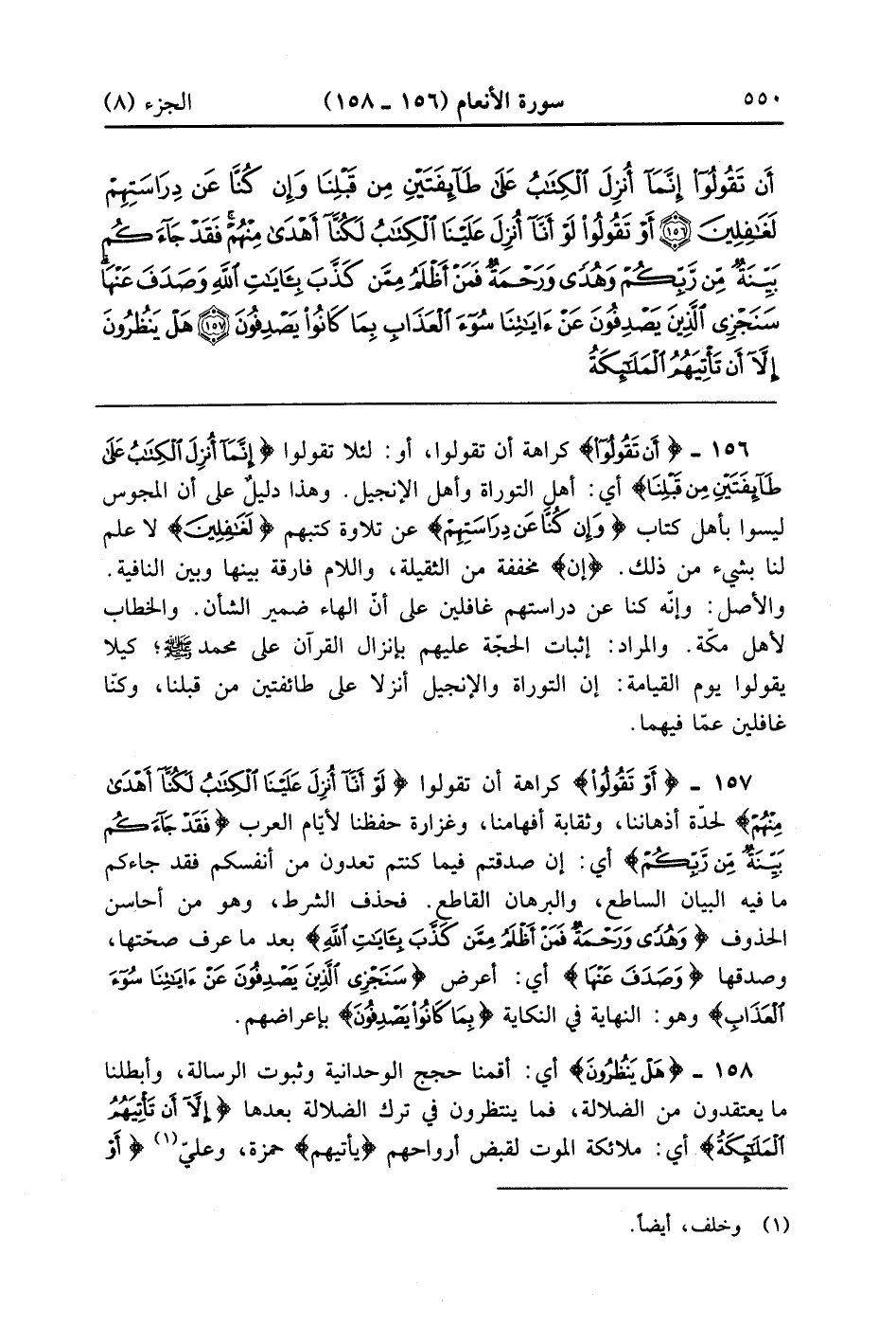 أَنْ تَقُولُوا إِنَّمَا أُنْزِلَ الْكِتَابُ عَلَى طَائِفَتَيْنِ مِنْ قَبْلِنَا وَإِنْ كُنَّا عَنْ دِرَاسَتِهِمْ لَغَافِلِينَ (156)