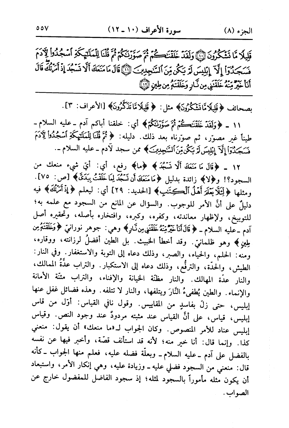 قَالَ مَا مَنَعَكَ أَلَّا تَسْجُدَ إِذْ أَمَرْتُكَ قَالَ أَنَا خَيْرٌ مِنْهُ خَلَقْتَنِي مِنْ نَارٍ وَخَلَقْتَهُ مِنْ طِينٍ (12)