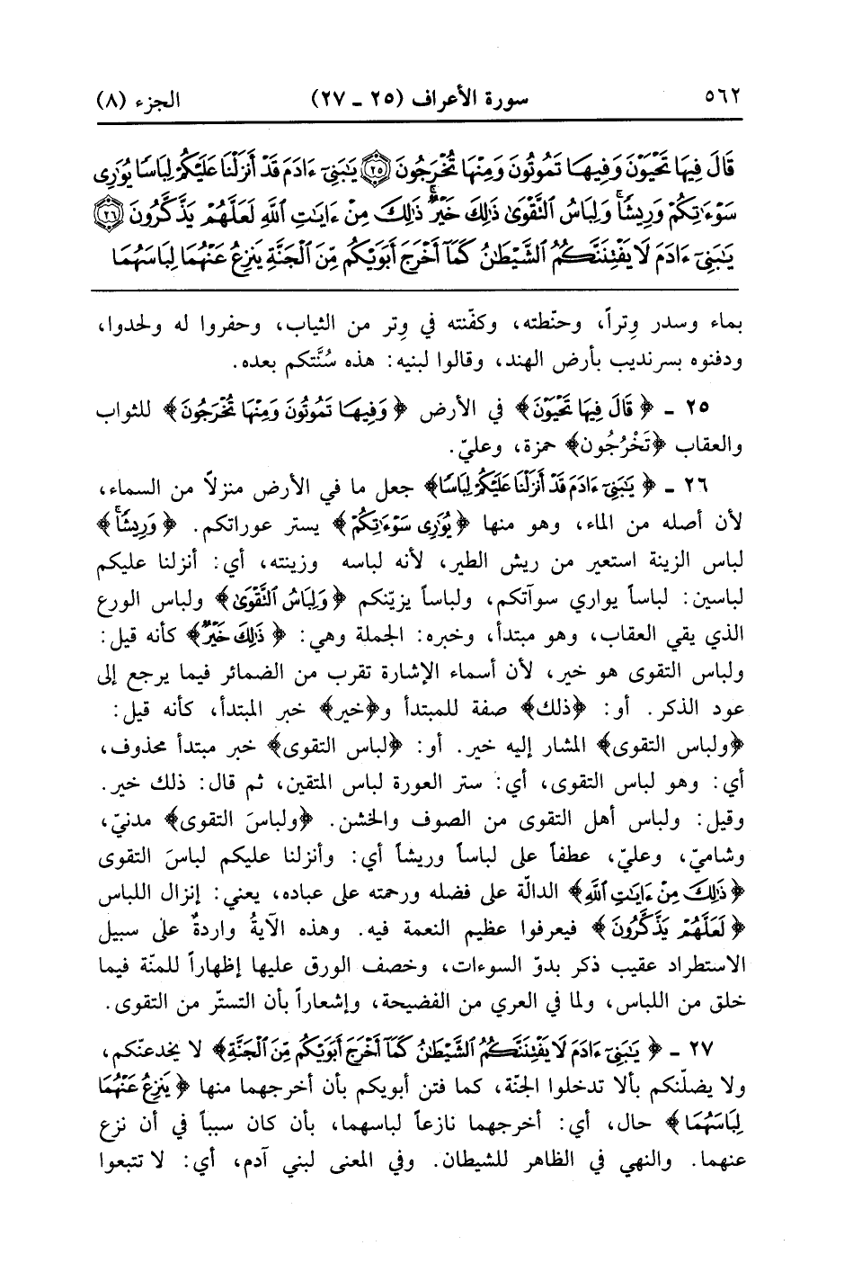 يَا بَنِي آدَمَ قَدْ أَنْزَلْنَا عَلَيْكُمْ لِبَاسًا يُوَارِي سَوْآتِكُمْ وَرِيشًا وَلِبَاسُ التَّقْوَى ذَلِكَ خَيْرٌ ذَلِكَ مِنْ آيَاتِ اللَّهِ لَعَلَّهُمْ يَذَّكَّرُونَ (26)