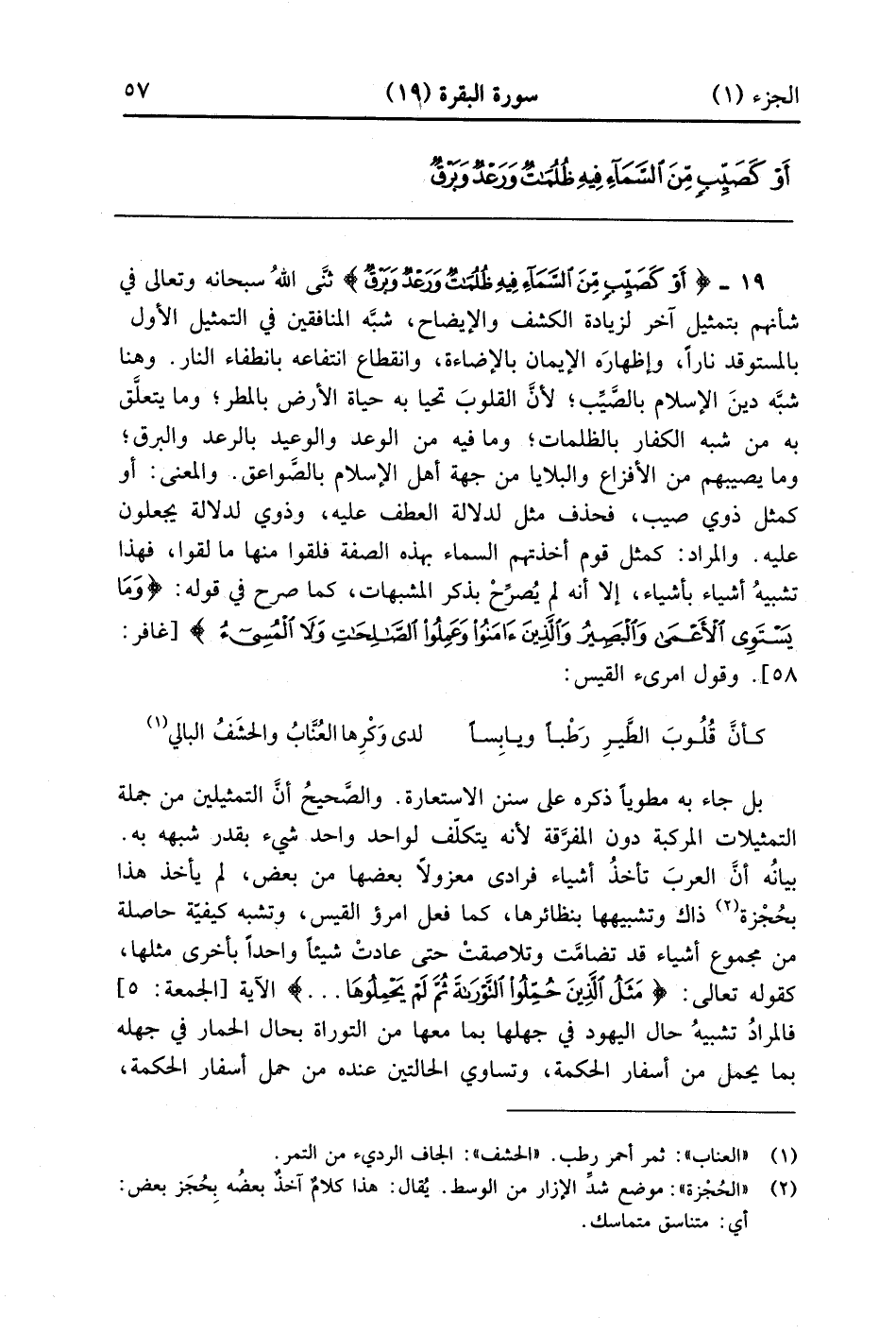 أَوْ كَصَيِّبٍ مِنَ السَّمَاءِ فِيهِ ظُلُمَاتٌ وَرَعْدٌ وَبَرْقٌ يَجْعَلُونَ أَصَابِعَهُمْ فِي آذَانِهِمْ مِنَ الصَّوَاعِقِ حَذَرَ الْمَوْتِ وَاللَّهُ مُحِيطٌ بِالْكَافِرِينَ (19)