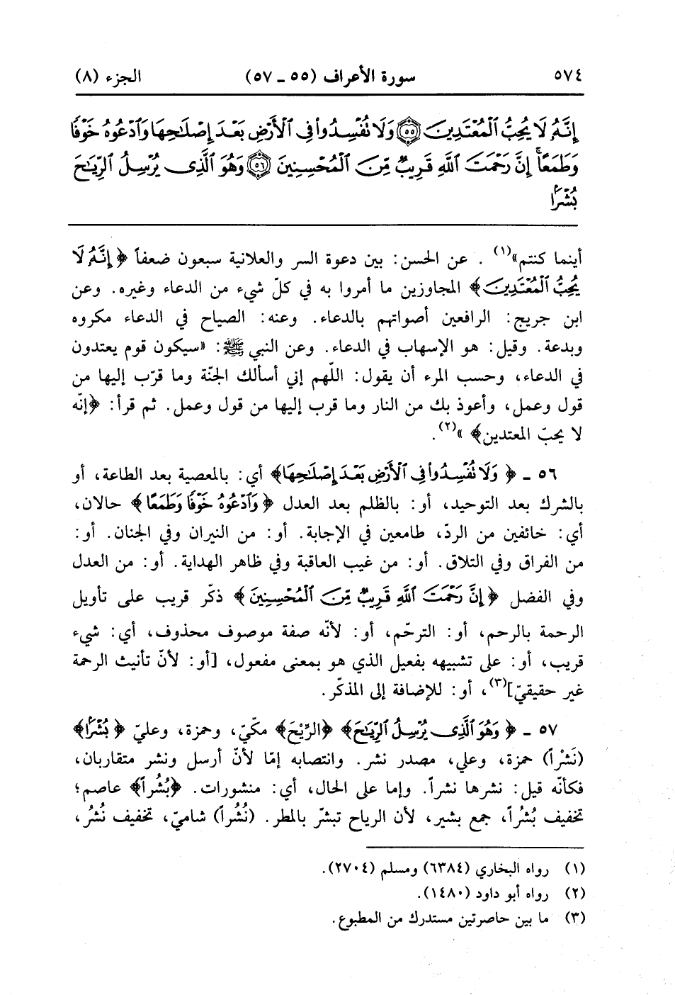 {ولا تفسدوا في الأرض بعد إصلاحها} أي بالمعصية بعد الطاعة أو بالشرك بعد التوحيد أو بالظلم بعد العد ل {وادعوه خوفاً وطمعاً} حالان أي خائفين من الرد طامعين في الإجابة أو من النيران وفي الجنان أو من الفراق وفي التلاق أو من غيب العاقبة وفي ظاهر الهداية أو من العدل وفى الفضل {إن رحمة الله قريبٌ مّن المحسنين} ذكر قريب على تأويل الرحمة بالحم أو الترحم أو لأنه صفة موصوف محذوف أي شيء قريب أو على تشبيهه بفعيل الذي هو بمعنى مفعول أو لأن تأنيث الرحمة غير تحقيقى أو للإضافة إلى المذكر