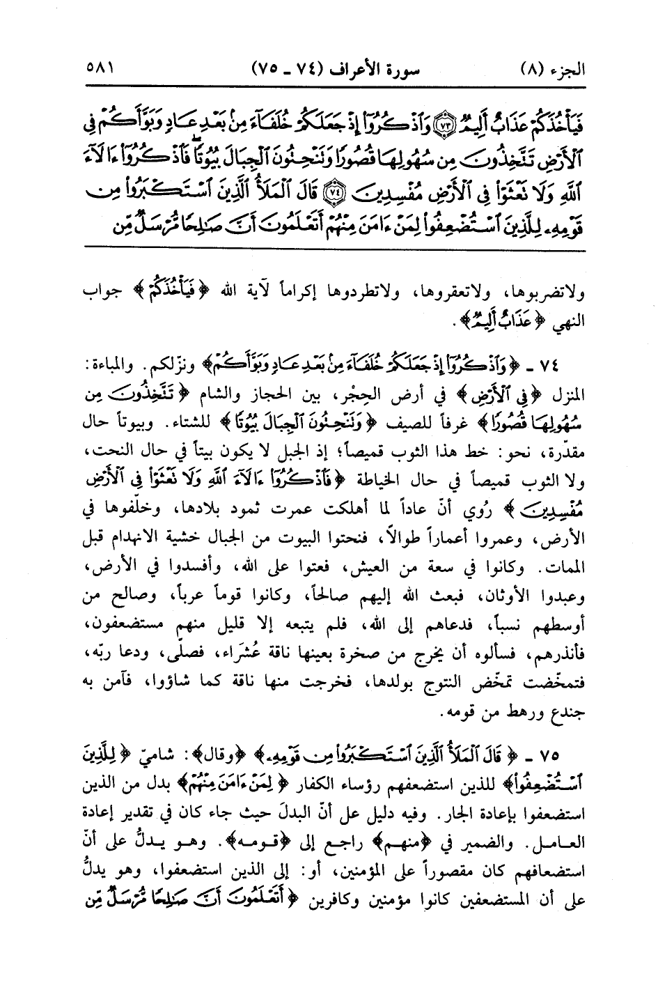 وَاذْكُرُوا إِذْ جَعَلَكُمْ خُلَفَاءَ مِنْ بَعْدِ عَادٍ وَبَوَّأَكُمْ فِي الْأَرْضِ تَتَّخِذُونَ مِنْ سُهُولِهَا قُصُورًا وَتَنْحِتُونَ الْجِبَالَ بُيُوتًا فَاذْكُرُوا آلَاءَ اللَّهِ وَلَا تَعْثَوْا فِي الْأَرْضِ مُفْسِدِينَ (74)
