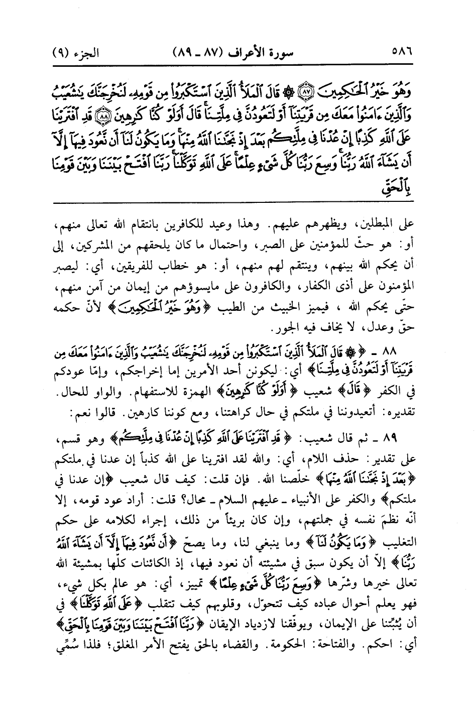 قَدِ افْتَرَيْنَا عَلَى اللَّهِ كَذِبًا إِنْ عُدْنَا فِي مِلَّتِكُمْ بَعْدَ إِذْ نَجَّانَا اللَّهُ مِنْهَا وَمَا يَكُونُ لَنَا أَنْ نَعُودَ فِيهَا إِلَّا أَنْ يَشَاءَ اللَّهُ رَبُّنَا وَسِعَ رَبُّنَا كُلَّ شَيْءٍ عِلْمًا عَلَى اللَّهِ تَوَكَّلْنَا رَبَّنَا افْتَحْ بَيْنَنَا وَبَيْنَ قَوْمِنَا بِالْحَقِّ وَأَنْتَ خَيْرُ الْفَاتِحِينَ (89)