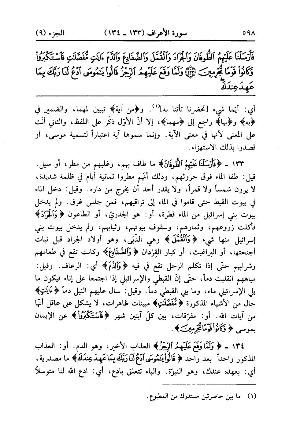 فَأَرْسَلْنَا عَلَيْهِمُ الطُّوفَانَ وَالْجَرَادَ وَالْقُمَّلَ وَالضَّفَادِعَ وَالدَّمَ آيَاتٍ مُفَصَّلَاتٍ فَاسْتَكْبَرُوا وَكَانُوا قَوْمًا مُجْرِمِينَ (133)