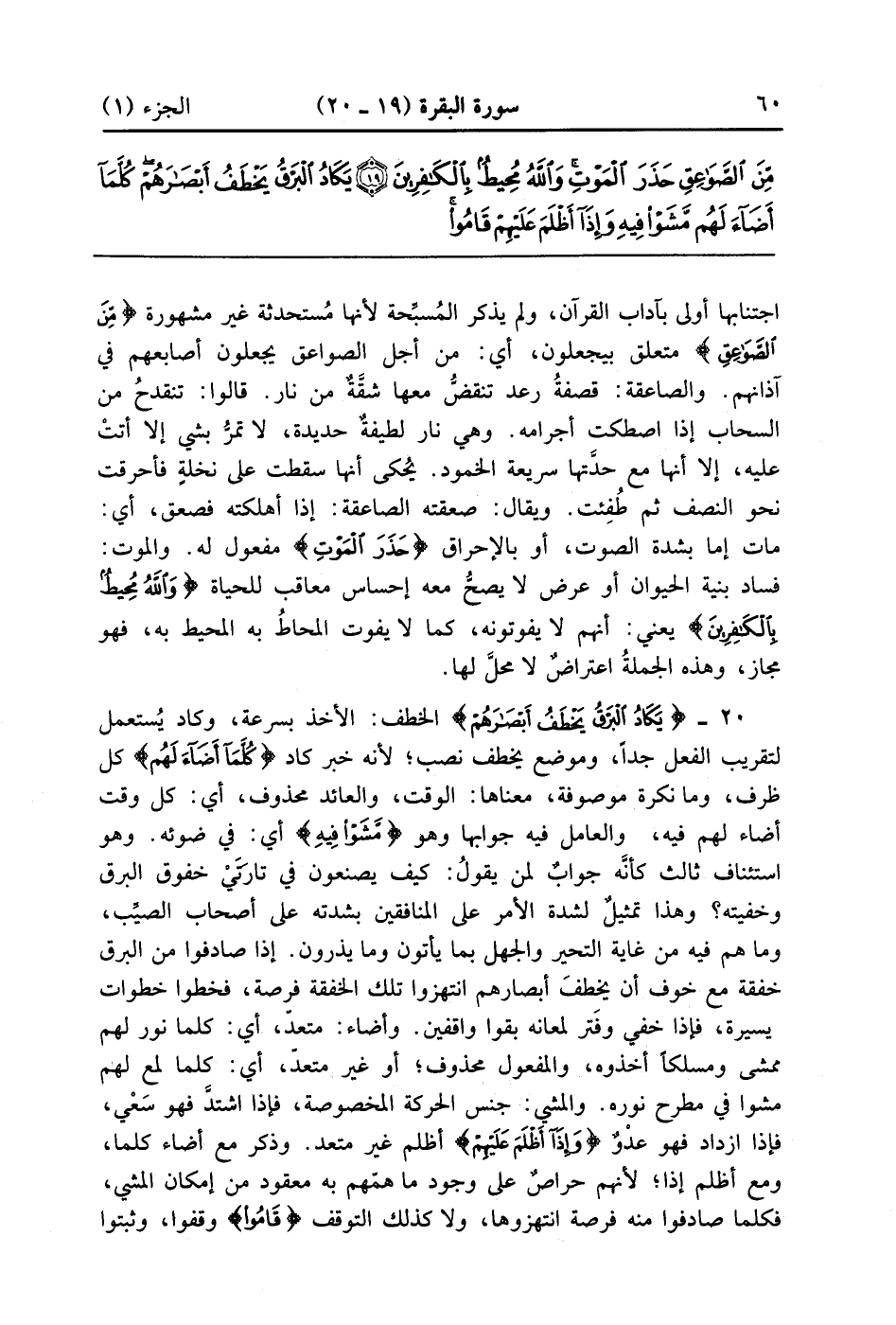 يَكَادُ الْبَرْقُ يَخْطَفُ أَبْصَارَهُمْ كُلَّمَا أَضَاءَ لَهُمْ مَشَوْا فِيهِ وَإِذَا أَظْلَمَ عَلَيْهِمْ قَامُوا وَلَوْ شَاءَ اللَّهُ لَذَهَبَ بِسَمْعِهِمْ وَأَبْصَارِهِمْ إِنَّ اللَّهَ عَلَى كُلِّ شَيْءٍ قَدِيرٌ (20)