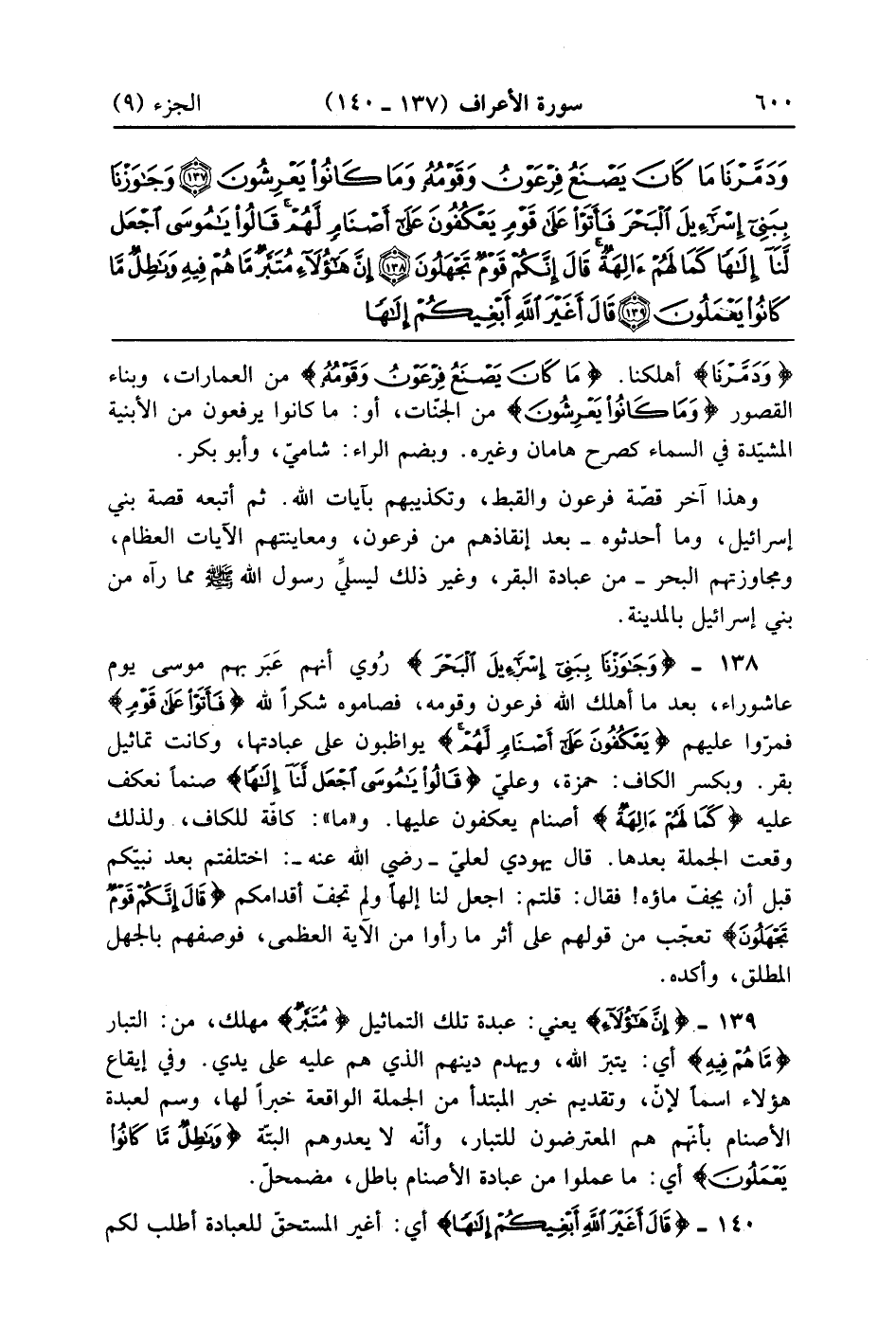 {وَدَمَّرْنَا} أهلكنا {مَا كَانَ يَصْنَعُ فِرْعَوْنُ وقومه} رمن العمارات وبناء القصور {وَمَا كَانُواْ يَعْرِشُونَ} من الجنات أو ما كانوا يرفعون من الأبنية المشيدة تفى السماء كصرح هامان وغيره وبضم الراء شامي وأبو بكر وهذا آخر صقة فرعون والقبط وتكذيبهم بآيات الله ثم أتبعه قصة بني إسرائيل وما أحدثوه بعد إنقاذهم من قرعون ومعاينتهم الآيات العظام ومجاوزتهم البحر من عبادة البقر وغير ذلك ليتسلى رسول الله صلى الله عليه وسلم مما رآه من بني إسرائيل بالمدينة