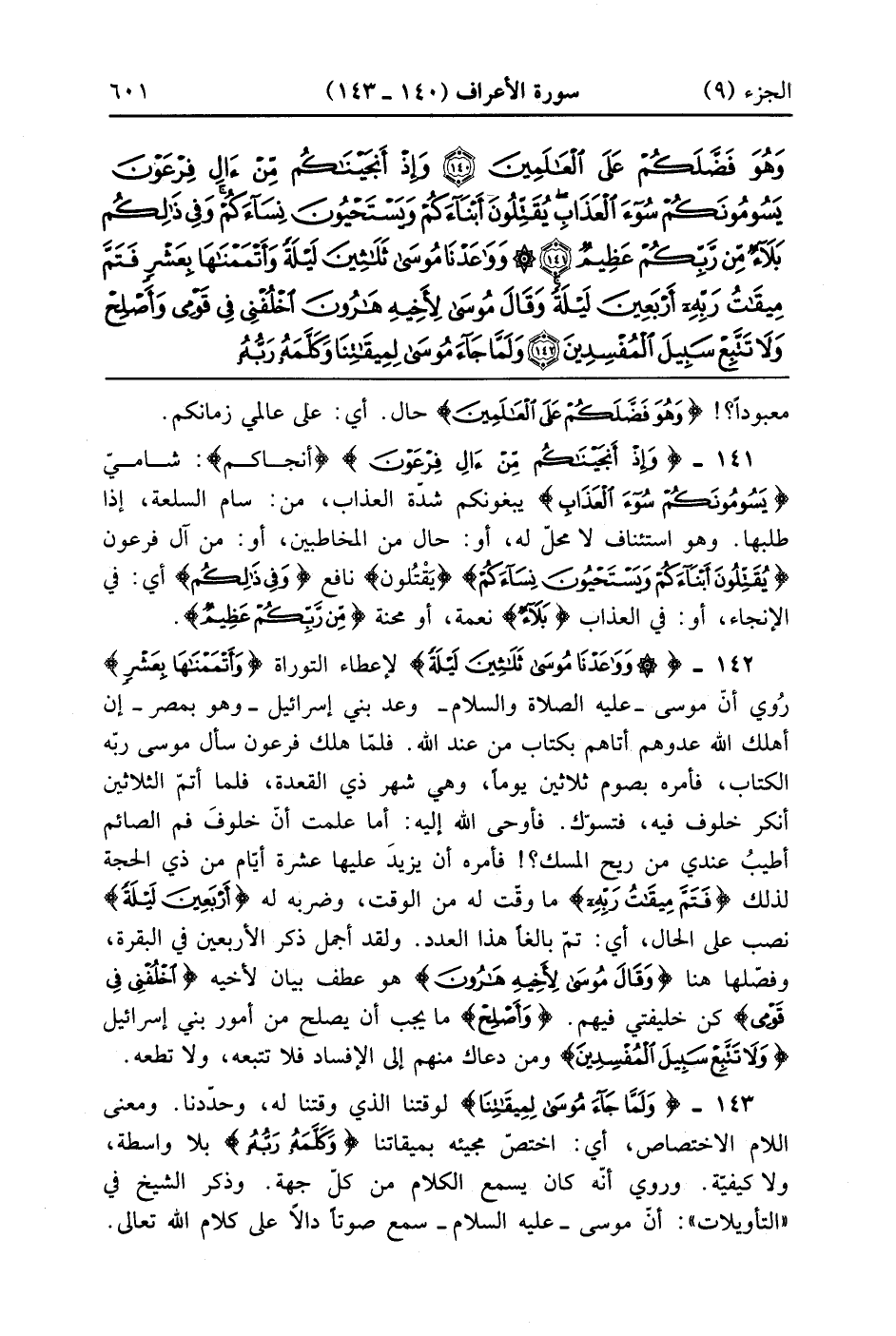 وَوَاعَدْنَا مُوسَى ثَلَاثِينَ لَيْلَةً وَأَتْمَمْنَاهَا بِعَشْرٍ فَتَمَّ مِيقَاتُ رَبِّهِ أَرْبَعِينَ لَيْلَةً وَقَالَ مُوسَى لِأَخِيهِ هَارُونَ اخْلُفْنِي فِي قَوْمِي وَأَصْلِحْ وَلَا تَتَّبِعْ سَبِيلَ الْمُفْسِدِينَ (142)
