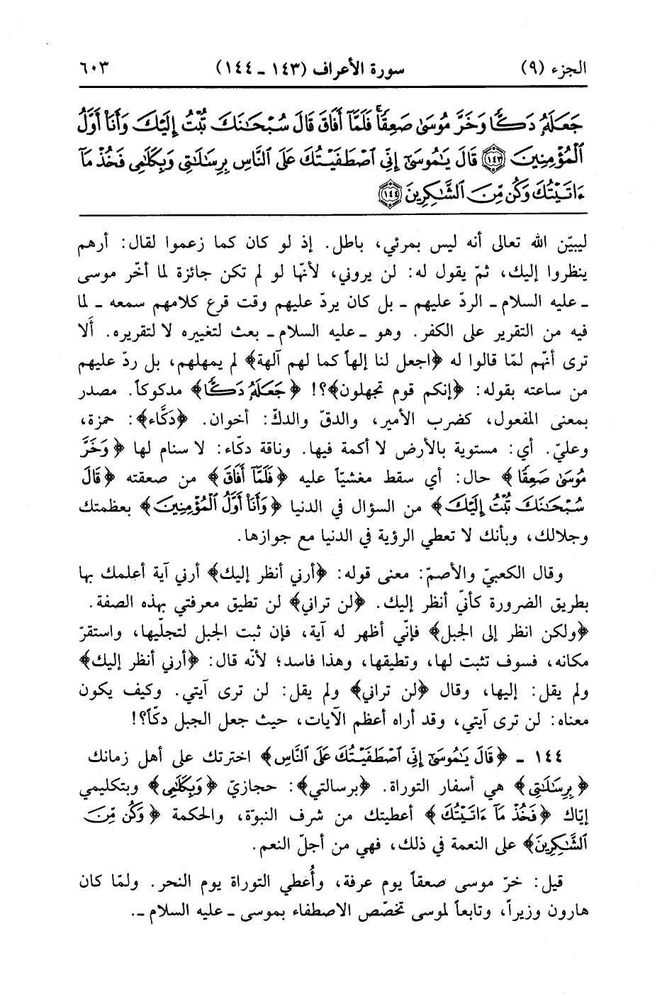 ليبين الله تعالى أنه ليس بمرئي باطل إذ لو كان كما زعموا لقال أرهم ينظروا إليك ثم يقول له لن يروني ولانها لولم تكن جاءزة لما أخر موسى عليه السلام الرد عليهم بل كان يرد عليهم وقت قرع كلامهم سمعه لما فيه من التقرير على الكف روهو عليه السلام بعث لتغيره لا لتقريره إلا ترى أنهم لما قال له جعل لنا إلهاً كما لهم آلهة لم يمهلهم بل رد عليهم من ساعته بقوله إنكم قوم تجهلون {جعله دكا} مدكوكا مصدر بمعنى المفعول كضرب الأمير والدق والدك أخوان دكاء حمزة وعلى أى مستيوة بالأرض لا أكمه فيها وناقة دكا لاسنام لها {وخرّ موسى صعقاً} حال أي سقط مغشياً عليه {فلمّآ أفاق} من صعقته {قال سبحانك تبت إليك} من السوال في الدنيا {وأنا أوّل المؤمنين} بعظمتك وجلالك وأنك لا تعطي الرؤية في الدنيا مع جوازها وقال الكعبي والأصم معنى قوله أرني أنظر اليك ارنى آية أعلمكم بها بطريق الضرورة كأني أنظر إليك لن تراني لن تطيق معرفتي بهذه الصفة ولكن انظر إلى الجبل فإني أظهر له آية فإن ثتب الجبل لتجليها وساتقر مكانه فسوف تثبت لها وتطيقها وهذا فاسد لأنه قال أرني أنظر إليك ولم يقل إليها وقال ولن ترانى ولم يقار لن رتى آيتى وكيف يكوف معناه لن ترى آيتي وقد أراه أعظم الآيات حيث جعل الجبل دكا
