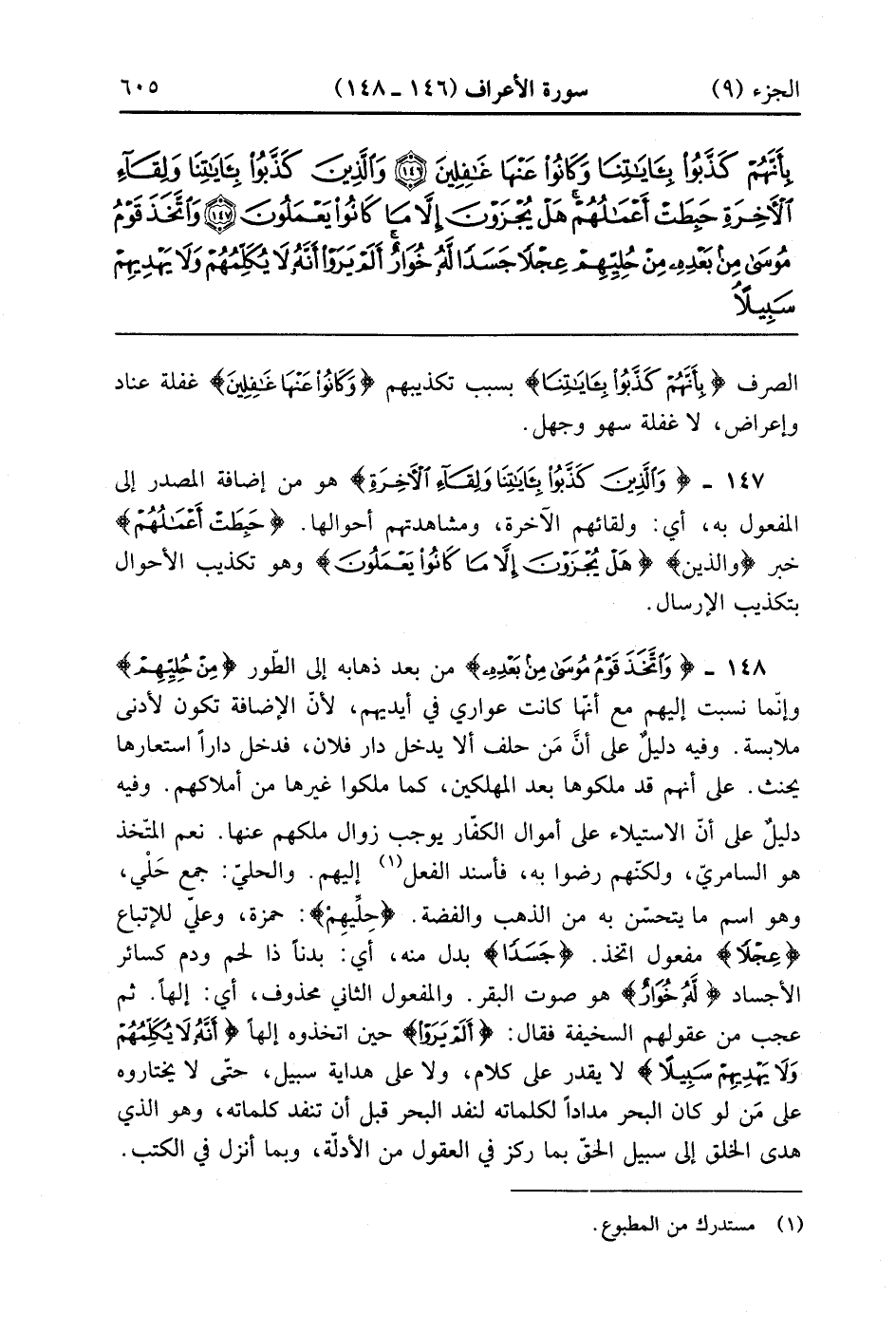 وَاتَّخَذَ قَوْمُ مُوسَى مِنْ بَعْدِهِ مِنْ حُلِيِّهِمْ عِجْلًا جَسَدًا لَهُ خُوَارٌ أَلَمْ يَرَوْا أَنَّهُ لَا يُكَلِّمُهُمْ وَلَا يَهْدِيهِمْ سَبِيلًا اتَّخَذُوهُ وَكَانُوا ظَالِمِينَ (148)
