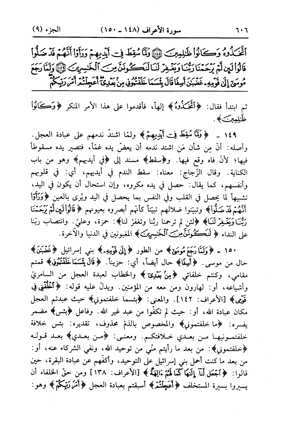 وَلَمَّا رَجَعَ مُوسَى إِلَى قَوْمِهِ غَضْبَانَ أَسِفًا قَالَ بِئْسَمَا خَلَفْتُمُونِي مِنْ بَعْدِي أَعَجِلْتُمْ أَمْرَ رَبِّكُمْ وَأَلْقَى الْأَلْوَاحَ وَأَخَذَ بِرَأْسِ أَخِيهِ يَجُرُّهُ إِلَيْهِ قَالَ ابْنَ أُمَّ إِنَّ الْقَوْمَ اسْتَضْعَفُونِي وَكَادُوا يَقْتُلُونَنِي فَلَا تُشْمِتْ بِيَ الْأَعْدَاءَ وَلَا تَجْعَلْنِي مَعَ الْقَوْمِ الظَّالِمِينَ (150)