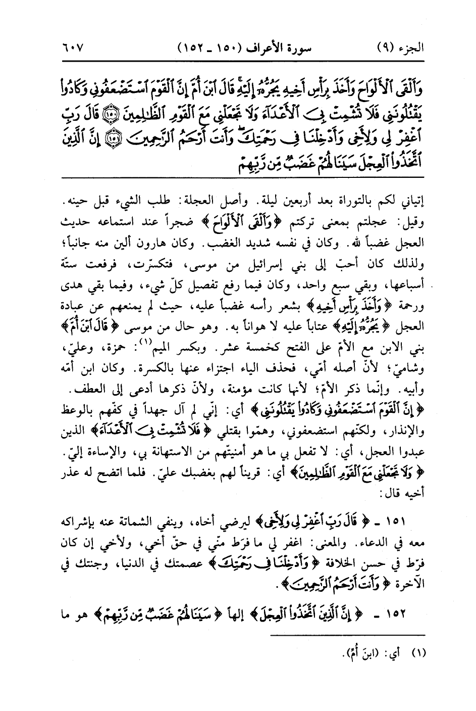 الأعراف 142 147 وشامى لأن أصله أمي فحذف الياء اجتزاء عنها بالكسرة وكان ابن أمه وأبيه وإنما ذكر الأم لأنها كانت مؤمنة ولأن ذكرها أدعى إلى العطف {إنّ القوم استضعفوني وكادوا يقتلونني} أي إني لم آل جهداً في كفهم بالوعظ والإنذار ولكنهم استضعفوني وهموا بقتلي {فلا تشمت بي الأعدآء} الذين عبدوا العجل أي لا تفعل بى ما هو أمنيتهم من الاستهاة بي والإساءة إلي {ولا تجعلني مع القوم الظّالمين} أي قريناً لهم بغضبك علي