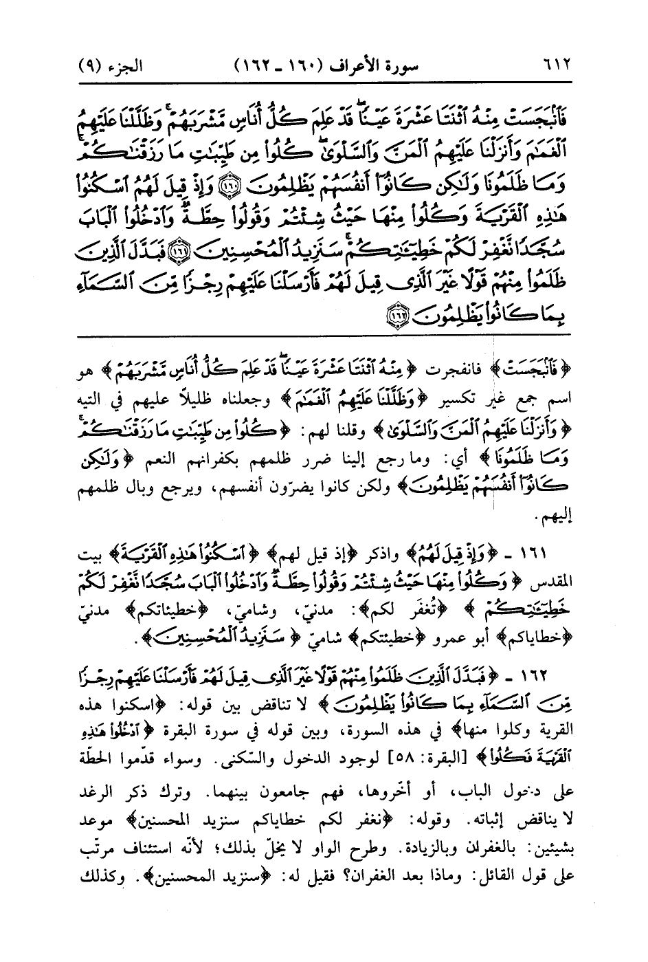 وَإِذْ قِيلَ لَهُمُ اسْكُنُوا هَذِهِ الْقَرْيَةَ وَكُلُوا مِنْهَا حَيْثُ شِئْتُمْ وَقُولُوا حِطَّةٌ وَادْخُلُوا الْبَابَ سُجَّدًا نَغْفِرْ لَكُمْ خَطِيئَاتِكُمْ سَنَزِيدُ الْمُحْسِنِينَ (161)
