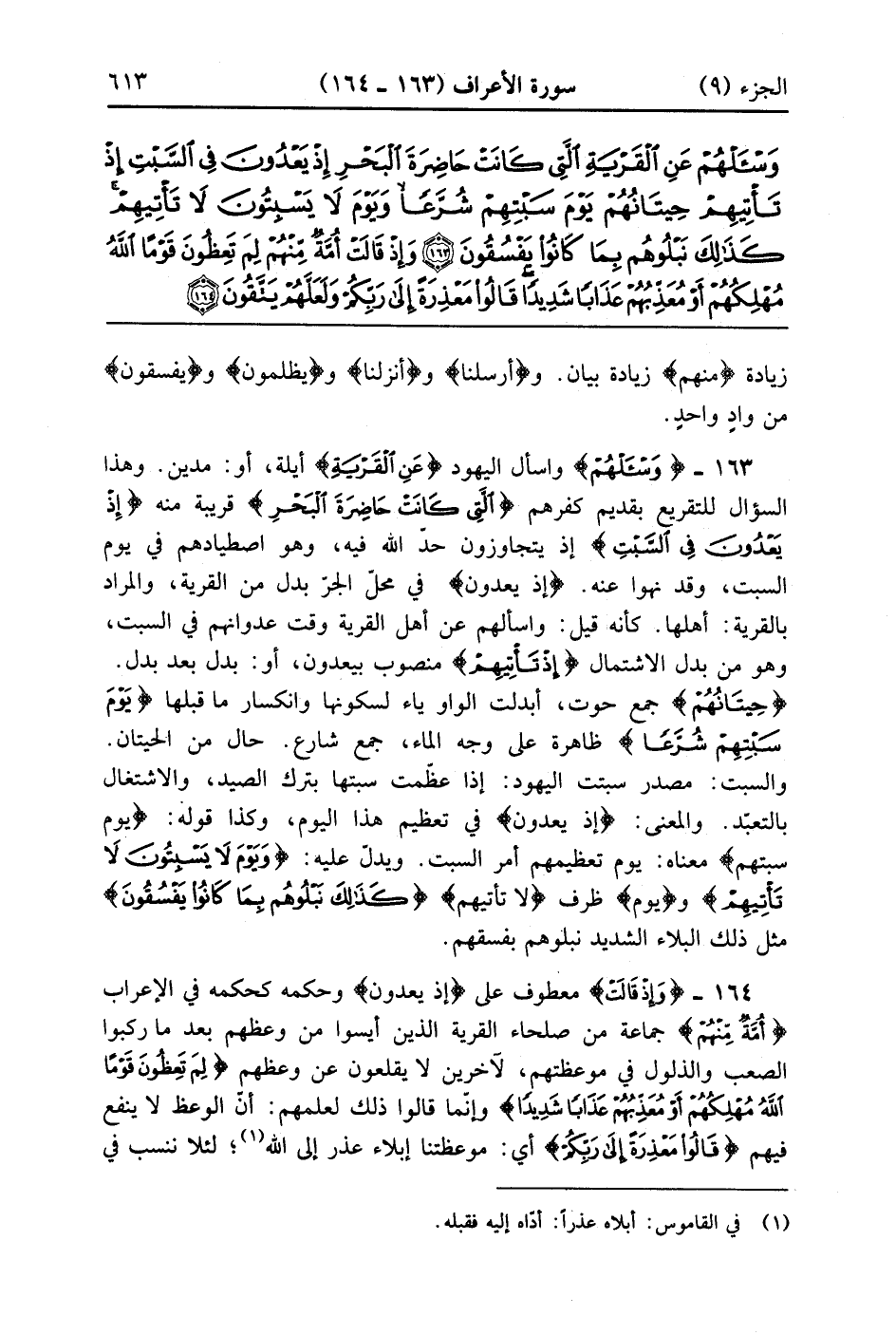وَاسْأَلْهُمْ عَنِ الْقَرْيَةِ الَّتِي كَانَتْ حَاضِرَةَ الْبَحْرِ إِذْ يَعْدُونَ فِي السَّبْتِ إِذْ تَأْتِيهِمْ حِيتَانُهُمْ يَوْمَ سَبْتِهِمْ شُرَّعًا وَيَوْمَ لَا يَسْبِتُونَ لَا تَأْتِيهِمْ كَذَلِكَ نَبْلُوهُمْ بِمَا كَانُوا يَفْسُقُونَ (163)