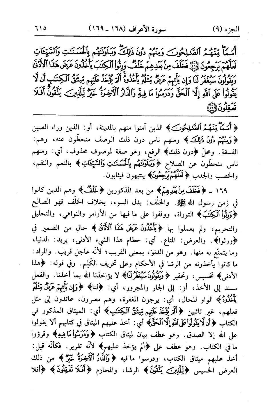 فَخَلَفَ مِنْ بَعْدِهِمْ خَلْفٌ وَرِثُوا الْكِتَابَ يَأْخُذُونَ عَرَضَ هَذَا الْأَدْنَى وَيَقُولُونَ سَيُغْفَرُ لَنَا وَإِنْ يَأْتِهِمْ عَرَضٌ مِثْلُهُ يَأْخُذُوهُ أَلَمْ يُؤْخَذْ عَلَيْهِمْ مِيثَاقُ الْكِتَابِ أَنْ لَا يَقُولُوا عَلَى اللَّهِ إِلَّا الْحَقَّ وَدَرَسُوا مَا فِيهِ وَالدَّارُ الْآخِرَةُ خَيْرٌ لِلَّذِينَ يَتَّقُونَ أَفَلَا تَعْقِلُونَ (169)
