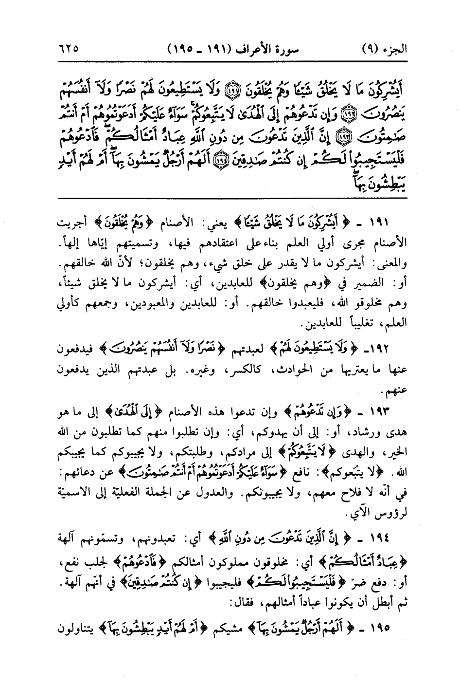 أَلَهُمْ أَرْجُلٌ يَمْشُونَ بِهَا أَمْ لَهُمْ أَيْدٍ يَبْطِشُونَ بِهَا أَمْ لَهُمْ أَعْيُنٌ يُبْصِرُونَ بِهَا أَمْ لَهُمْ آذَانٌ يَسْمَعُونَ بِهَا قُلِ ادْعُوا شُرَكَاءَكُمْ ثُمَّ كِيدُونِ فَلَا تُنْظِرُونِ (195)