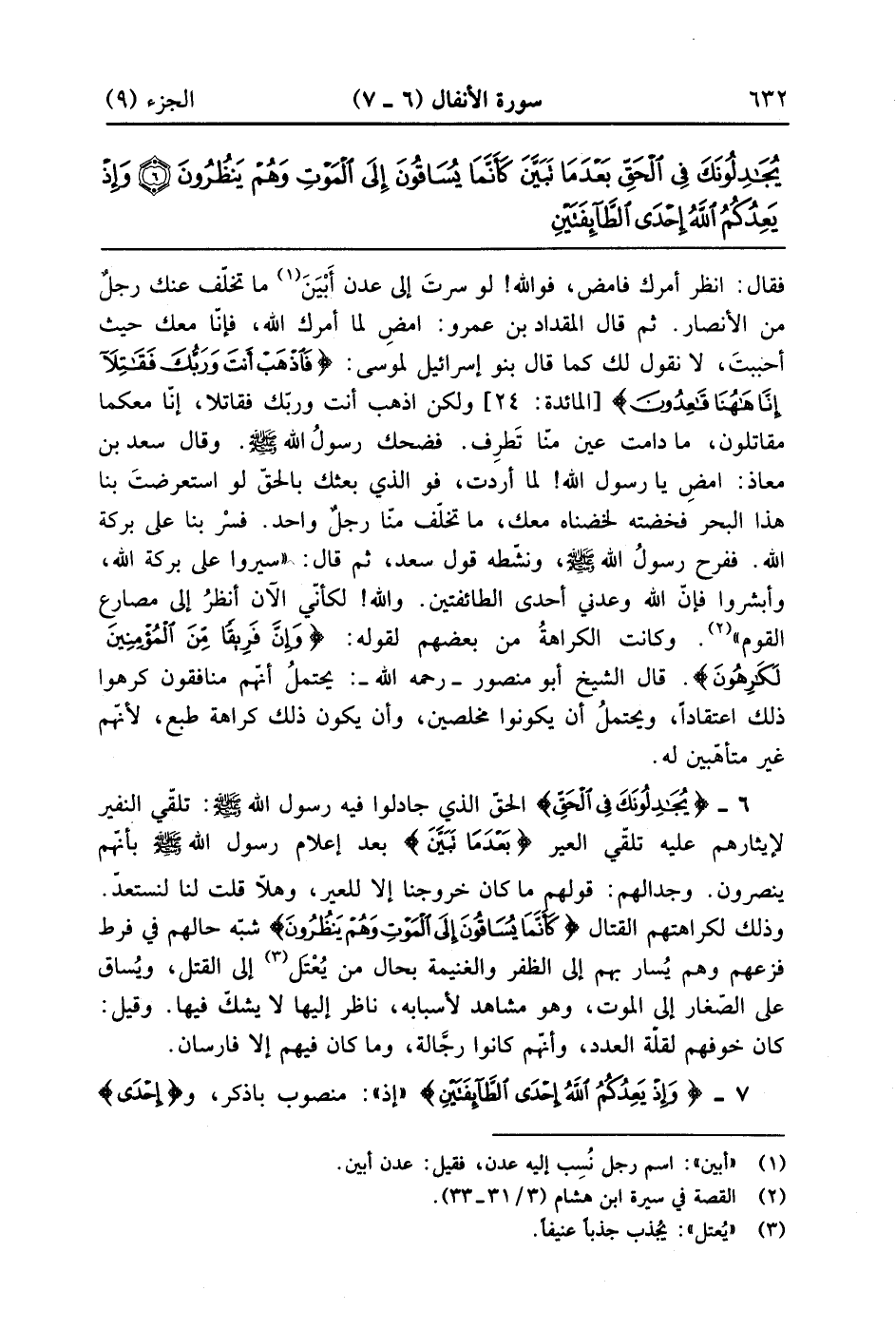 فقال انظر أمرك فامض فوالله لو سرت إلى عدن أبين ما تخلف عنك رجل من الانصار ثم قال المقداد ابن عمرو وامض لما أمرك الله فإنا ههنا قاعدون ولكن اذهب ولكن اذهب أنت وربكم فقاتلا إنا معكما مقاتلون مادامت عين منا تطرف فضحك رسول الله صلى الله عليه وسلم وقال سعد بن معاذ امض يا رسول الله لما أردت فوالذي بعثك بالحق لو استعرضت بنا هذا البحر فخضته فخضناه معك ما تخلف منا رجل واحد فسر بنا على بركة الله ففرح رسول الله صلى الله عليه وسلم ونشطه قول سعد ثم قال سيروا على بركة الله ابشروا فإن الله وعدنى غحدى الطائفتبين والله لكأني الآن أنظر إلى مصارع القوم وكانت الكراهة من بعضهم لقوله وَإِنَّ فَرِيقاً من المؤمنين لكارهون قال الشيخ أبو منصور رحمه الله يحتمل أنهم منافقون كرهوا ذلك اعتقاداً ويحتمل أن يكونوا مخلصين وأن يكون ذلك كراه طبع لأنهم غير متأهبين له