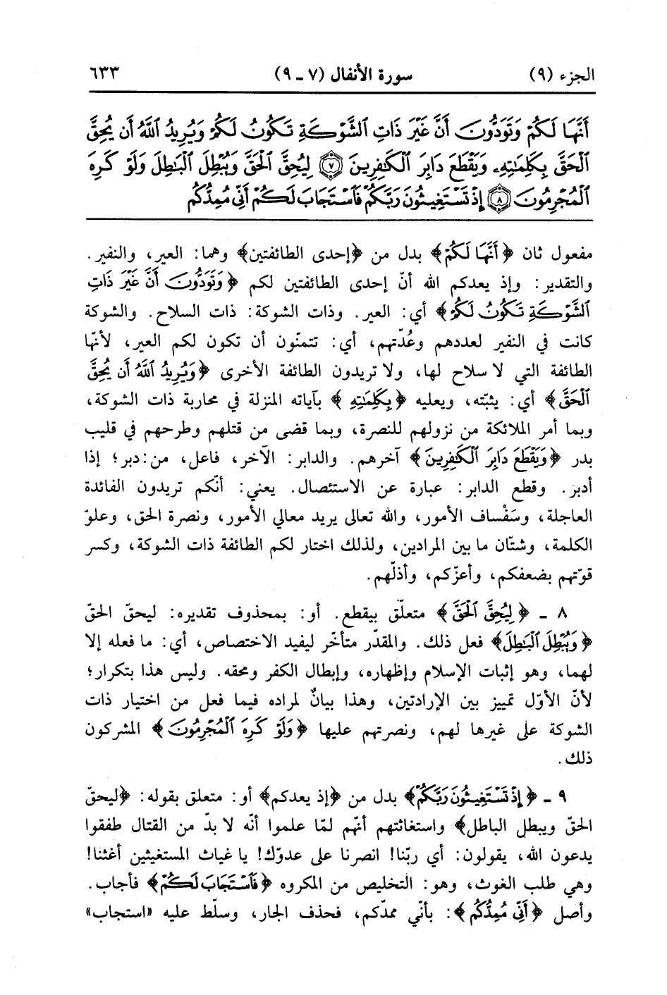مفعول ثانٍ {أَنَّهَا لَكُمْ} بدل من إِحْدَى الظائفتين وهما العير والنفير والتقدير وإذ يعدكم الله أن إحدة الطائفتين لكم {وَتَوَدُّونَ أَنَّ غَيْرَ ذَاتِ الشوكة تَكُونُ لَكُمْ} أي العير وذات الشوكة ذات السلاح كانت في النفير لعددهم وعدتهم أي تتمنون أن تكون لكم العير لأنها الطائفة التي لا سلاح لها ولا تريدون الطائة ف الأخرى {وَيُرِيدُ الله أَن يُحِقَّ الحَقَّ}