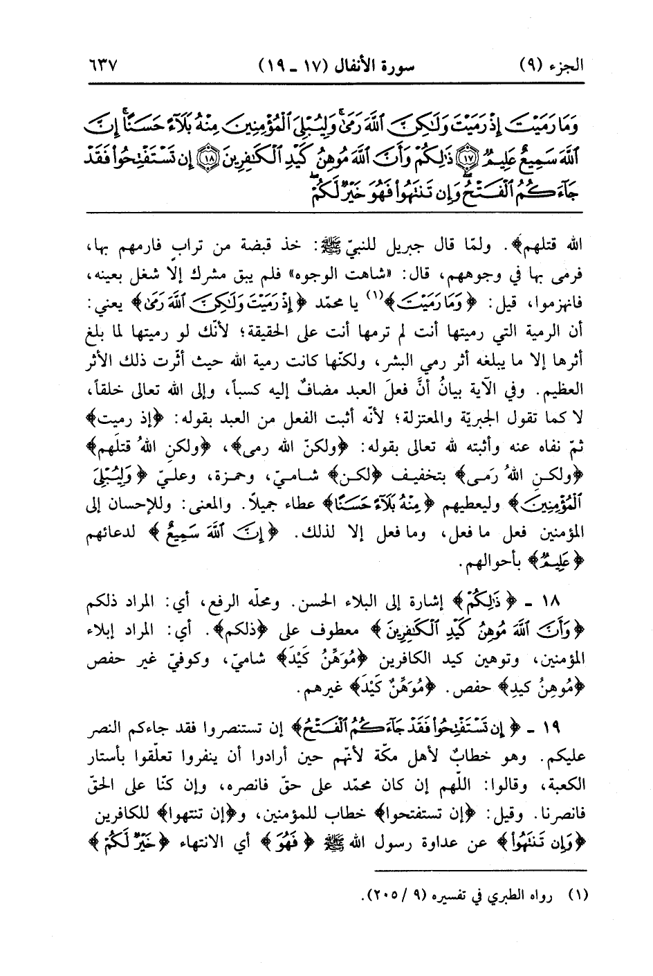 الله قتلهم ولما قال جبريل للنبى صلى الله عليه وسلم خذ قبضة من تراب فارمهم بها فرماى بها فى وجوهم وقال شاهت الوجوه فلم يبق مشرك إلا شغل بعينه فانهزموا قيل {وَمَا رَمَيْتَ} يا محمد {إِذْ رَمَيْتَ ولكن الله رمى} يعني أن الرمية التي رميتها أنت لم ترمها أنت على الحقيقة لأنك لو رميتها لما بلغ أثرها إلا ما يبلغه أثر رمي البشر ولكنها كانت رمية الله حيث أثرت ذلك الأثصر العظيم وفي الآية بيان أن فعل العبد مضاف إليه كسباً وإلى الله تعالى خلقاً لا كما تقول الجبرية والمعتزلة لأنه أثبت الفعل من العبد بقوله إِذْ رَمَيْتَ ثم نفاه عنه وأثبته لله تعالى بقوله ولكن الله رمى ولكنم الله قتلهم ولكمن الله رمى بتخفيف لَكِنِ شامي وحمزة وعلي {وليبلي المؤمنين} ولعيطيهم {منه بلاء حسنا} عطاء تجميلا والمعنى وللإحسان إلى المؤمنين فعل ما فعل وما فعل إلا لذلك {إِنَّ الله سَمِيعٌ} لدعائهم {عَلِيمٌ} بأحوالهم