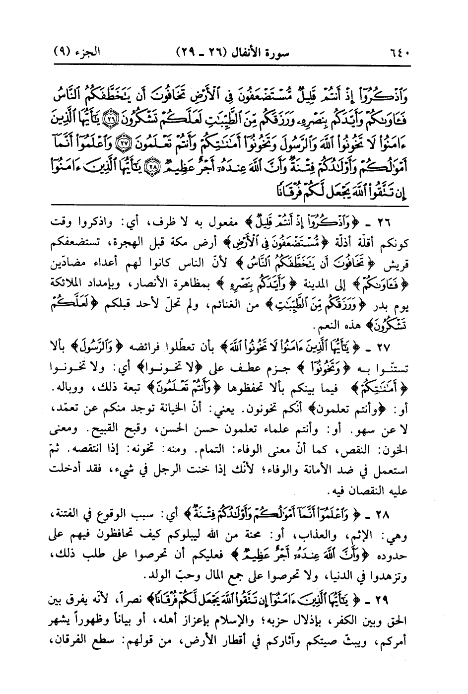 الأنفال 23 29 تحفظوها {وَأَنتُمْ تَعْلَمُونَ} تبعه ذلك ووباله أو وانتم تعملون انكم تخونون بعنى أن الخيانة توجد منكم عن تعمد لا عن سهو أو وانتع علماء تعلمون حسن وقبح القبيح ومعنى الخون النقص كما أن معنى الإيفاء التمام ومنه تخوّنه إذا انتقصه ثم استعمل فى ضد الأمانة والوافاء لانك إذا خنت الرحل في شيء فقد أدخلت عليه النقصان فيه