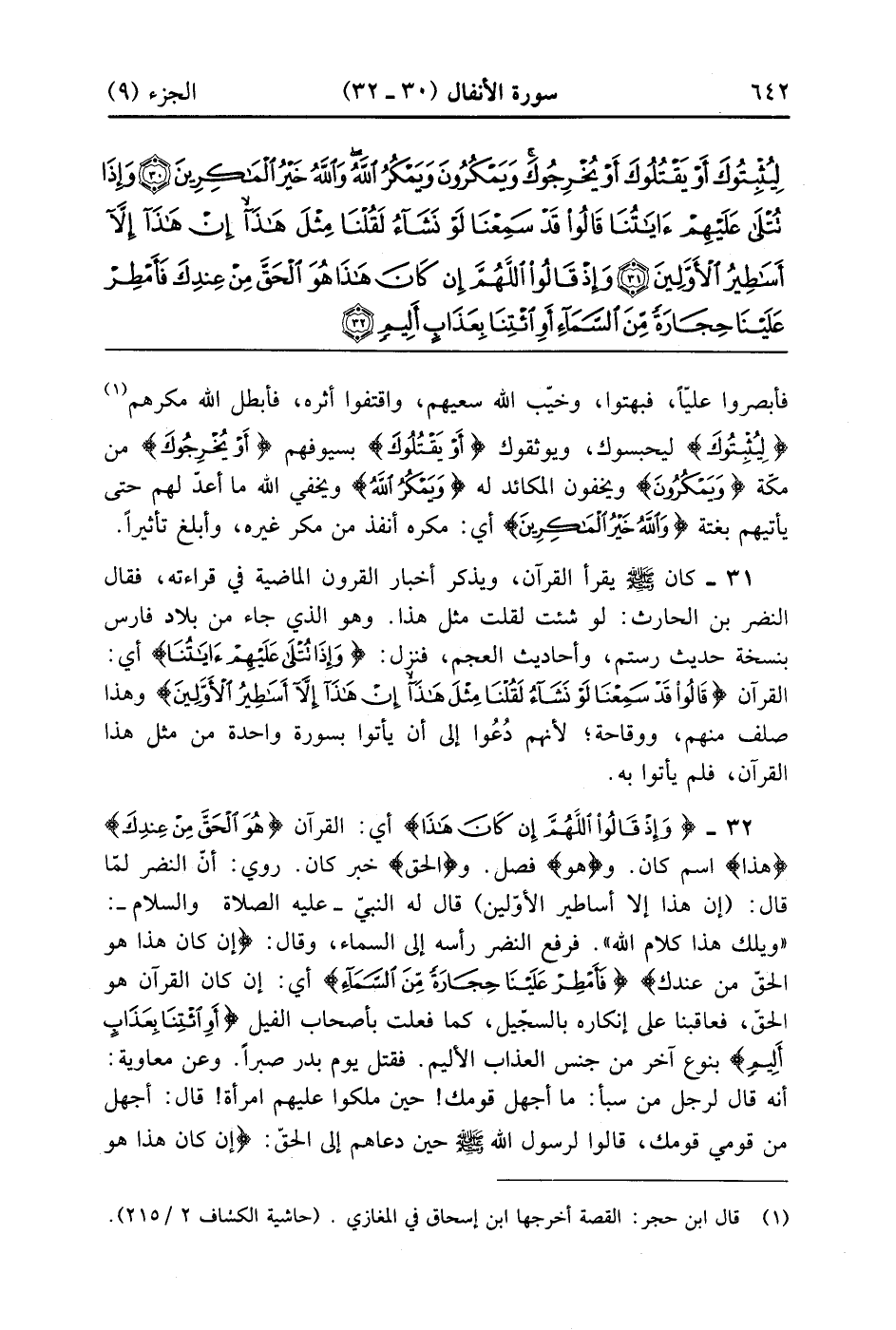 {وَإِذْ قَالُواْ اللهم إِن كَانَ هذا} أي القرآن {هُوَ الحق مِنْ عِندِكَ} هذا اسم كان هو فصل والحق خي كلان رُوي أن النضر لما قال إِنْ هذا إلا أساطير الاولين قال له النبى عليه السلام ويلك هذا كلام الله فرفع النضر رأسه إلى السماء وقال إِن كَانَ هذا هُوَ الحق مِنْ عِندِكَ {فَأَمْطِرْ عَلَيْنَا حِجَارَةً مّنَ السماء} أى أن كان القرانهو الحق فعاقبنا على إنكاره بالسجيل كما فعلت بأصحاب الفيل {أَوِ ائتنا بِعَذَابٍ} أَلِيمٍ بنوع آخر ن جنس العذاب الأليم فقتل يوم بدر صبراً وعن معاية أنه قال لرجل من سبأ ما أجهل قومك حين ملكوا عليهم امرأة قال أجهل من قومي قومك قالوا لرسول الله عليه السلام حين دعاهم إلى الحق إِن كَانَ هذه هُوَ