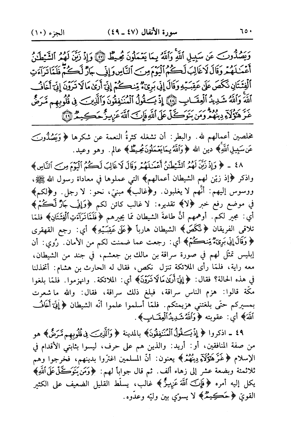وَإِذْ زَيَّنَ لَهُمُ الشَّيْطَانُ أَعْمَالَهُمْ وَقَالَ لَا غَالِبَ لَكُمُ الْيَوْمَ مِنَ النَّاسِ وَإِنِّي جَارٌ لَكُمْ فَلَمَّا تَرَاءَتِ الْفِئَتَانِ نَكَصَ عَلَى عَقِبَيْهِ وَقَالَ إِنِّي بَرِيءٌ مِنْكُمْ إِنِّي أَرَى مَا لَا تَرَوْنَ إِنِّي أَخَافُ اللَّهَ وَاللَّهُ شَدِيدُ الْعِقَابِ (48)