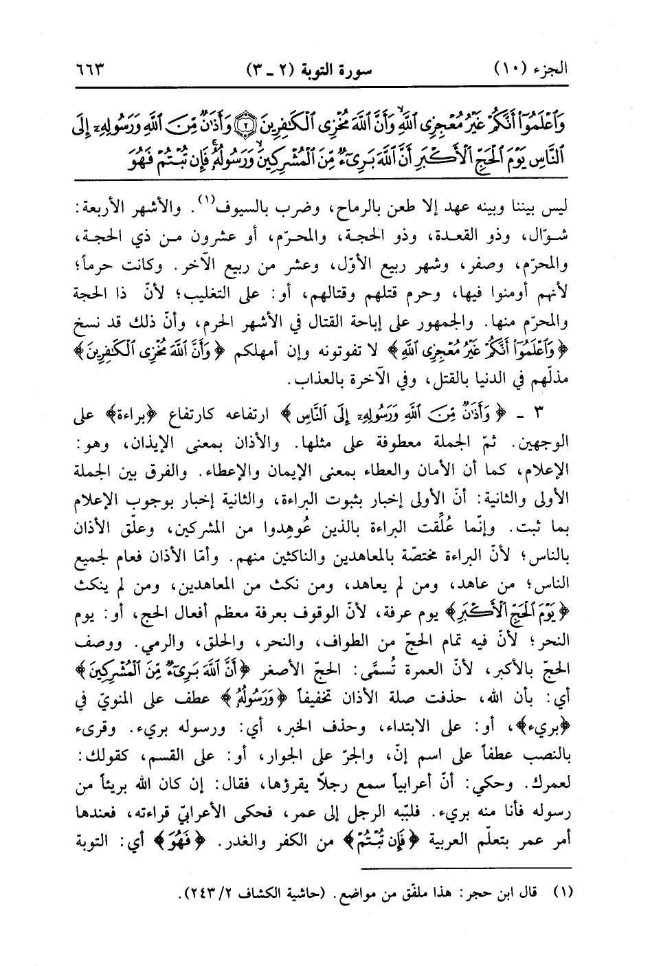 وَأَذَانٌ مِنَ اللَّهِ وَرَسُولِهِ إِلَى النَّاسِ يَوْمَ الْحَجِّ الْأَكْبَرِ أَنَّ اللَّهَ بَرِيءٌ مِنَ الْمُشْرِكِينَ وَرَسُولُهُ فَإِنْ تُبْتُمْ فَهُوَ خَيْرٌ لَكُمْ وَإِنْ تَوَلَّيْتُمْ فَاعْلَمُوا أَنَّكُمْ غَيْرُ مُعْجِزِي اللَّهِ وَبَشِّرِ الَّذِينَ كَفَرُوا بِعَذَابٍ أَلِيمٍ (3)
