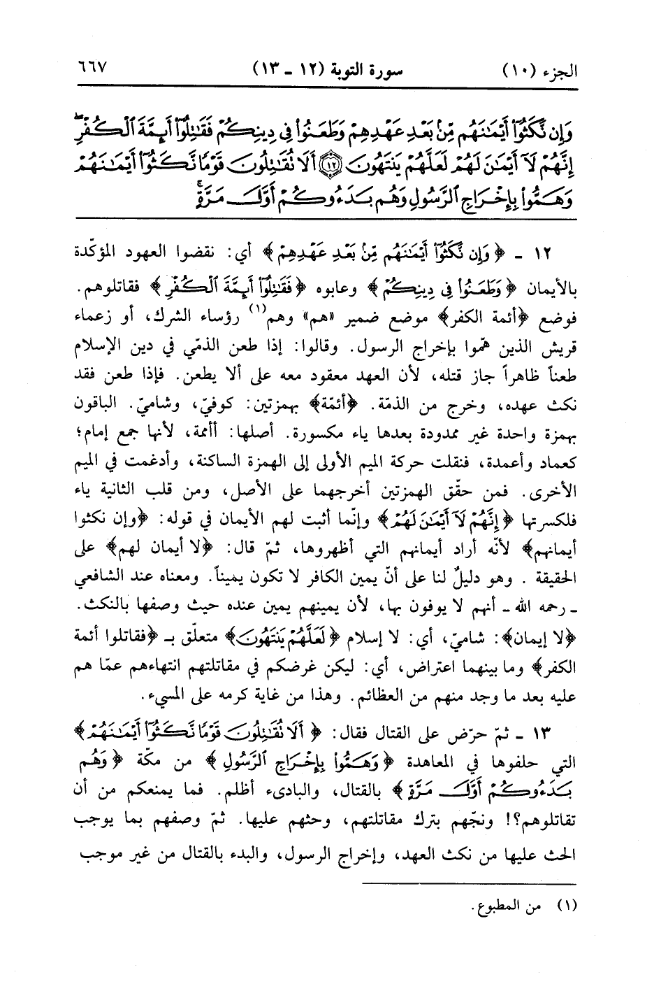 وَإِنْ نَكَثُوا أَيْمَانَهُمْ مِنْ بَعْدِ عَهْدِهِمْ وَطَعَنُوا فِي دِينِكُمْ فَقَاتِلُوا أَئِمَّةَ الْكُفْرِ إِنَّهُمْ لَا أَيْمَانَ لَهُمْ لَعَلَّهُمْ يَنْتَهُونَ (12)