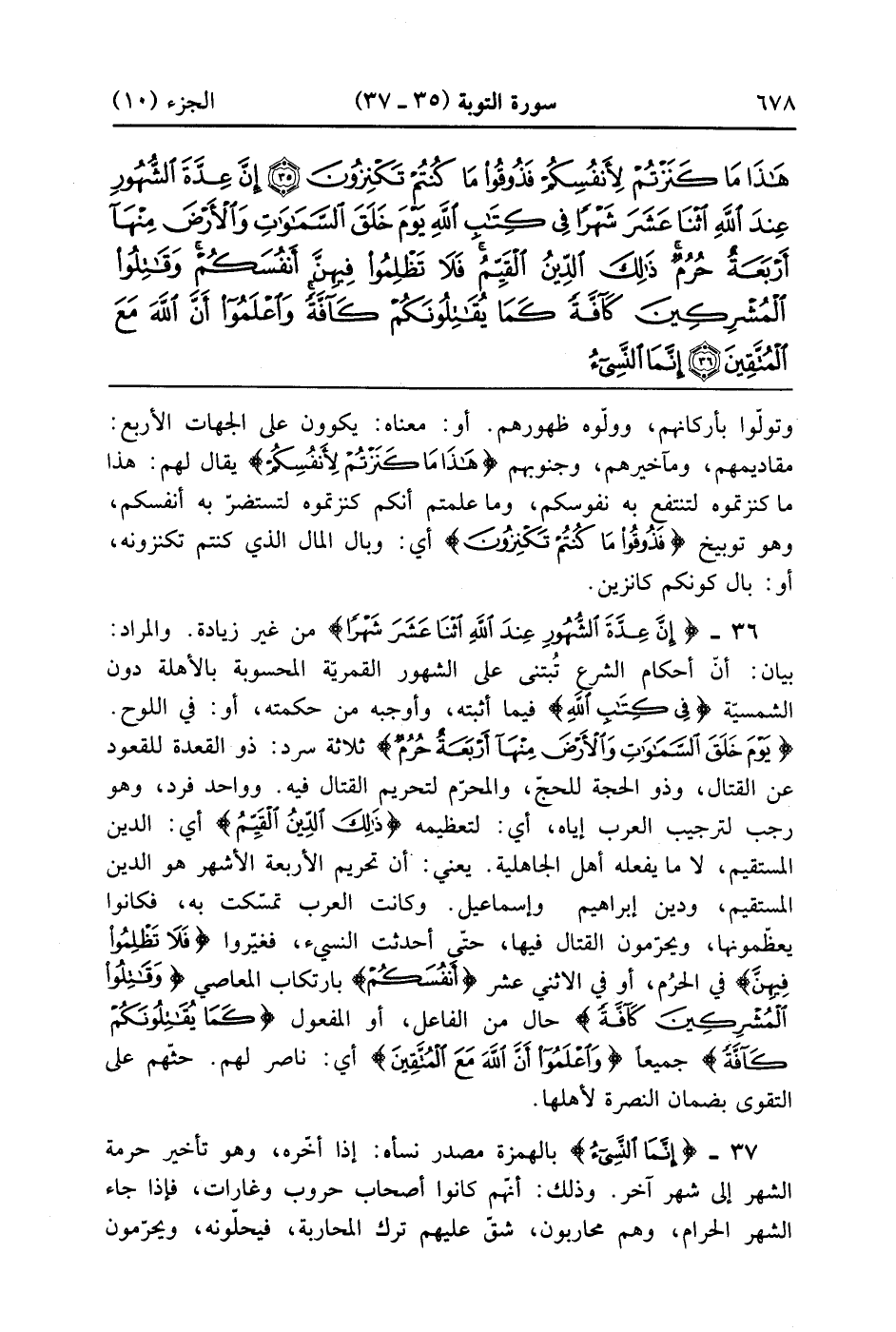إِنَّ عِدَّةَ الشُّهُورِ عِنْدَ اللَّهِ اثْنَا عَشَرَ شَهْرًا فِي كِتَابِ اللَّهِ يَوْمَ خَلَقَ السَّمَاوَاتِ وَالْأَرْضَ مِنْهَا أَرْبَعَةٌ حُرُمٌ ذَلِكَ الدِّينُ الْقَيِّمُ فَلَا تَظْلِمُوا فِيهِنَّ أَنْفُسَكُمْ وَقَاتِلُوا الْمُشْرِكِينَ كَافَّةً كَمَا يُقَاتِلُونَكُمْ كَافَّةً وَاعْلَمُوا أَنَّ اللَّهَ مَعَ الْمُتَّقِينَ (36)