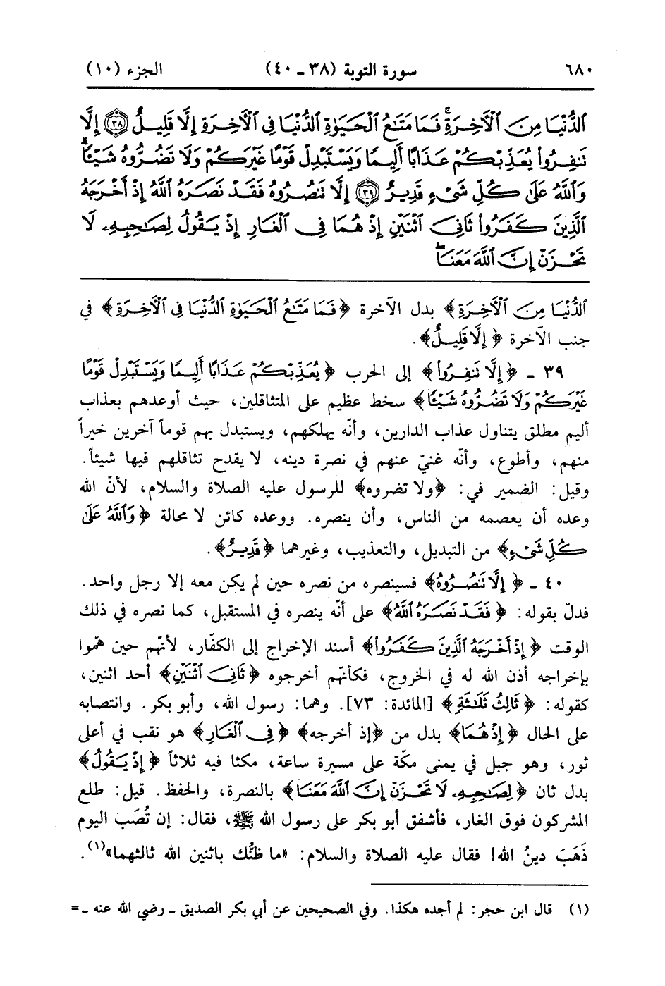 إِلَّا تَنْصُرُوهُ فَقَدْ نَصَرَهُ اللَّهُ إِذْ أَخْرَجَهُ الَّذِينَ كَفَرُوا ثَانِيَ اثْنَيْنِ إِذْ هُمَا فِي الْغَارِ إِذْ يَقُولُ لِصَاحِبِهِ لَا تَحْزَنْ إِنَّ اللَّهَ مَعَنَا فَأَنْزَلَ اللَّهُ سَكِينَتَهُ عَلَيْهِ وَأَيَّدَهُ بِجُنُودٍ لَمْ تَرَوْهَا وَجَعَلَ كَلِمَةَ الَّذِينَ كَفَرُوا السُّفْلَى وَكَلِمَةُ اللَّهِ هِيَ الْعُلْيَا وَاللَّهُ عَزِيزٌ حَكِيمٌ (40)